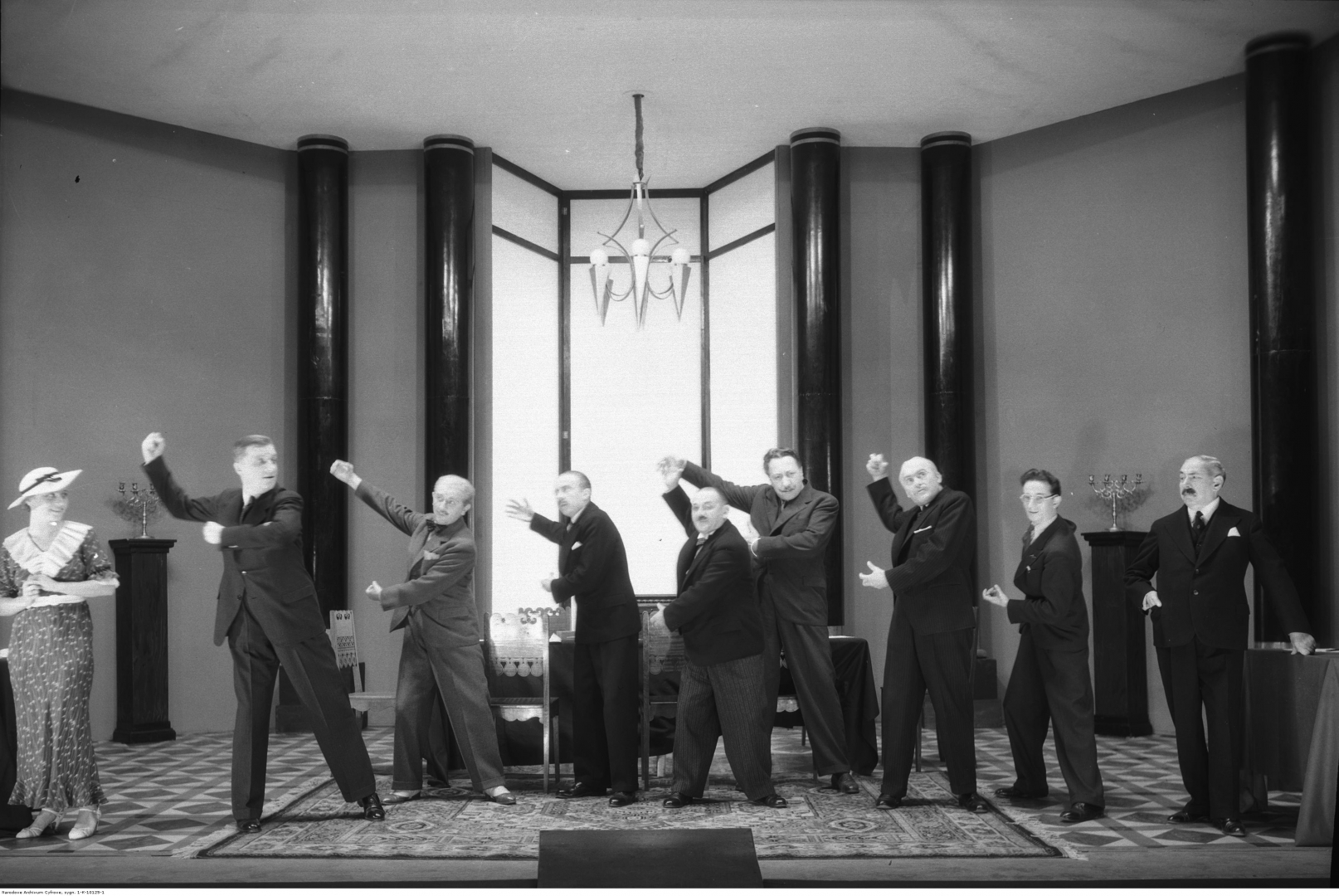 Na scenie widoczni m.in. Krystyna Ankwicz-Szyjkowska jako Herta, Mariusz Maszyński jako Gustaw Wiesinger (2. z lewej), Roman Wroński jako Prezes Mitro-Banku (3. z lewej),Tadeusz Kondrat jako Rudolf Fritsch (2. z prawej), Zygmunt Kułakowski jako Generalny Dyrektor Mitro-Banku (1. z prawej), Władysław Staszewski jako Walter, szef sekcji (4. z lewej), Ludwik Ruszkowski jako Nikolits, prokurent Mitro-Banku (4. z prawej).