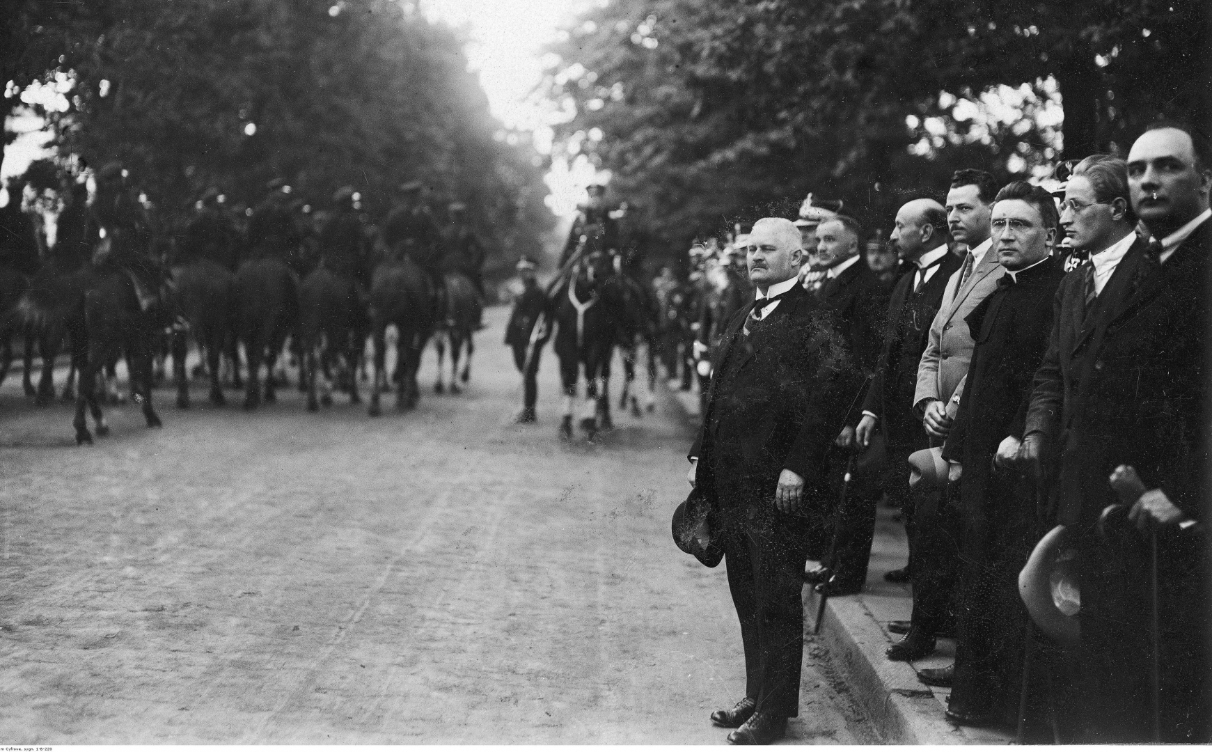 Wśród obserwatorów widoczni m.in.: minister spraw wewnętrznych Cyryl Ratajski (stoi na przedzie), komendant główny Policji Państwowej Marian Borzęcki, szef Policji Politycznej Marian Swolkień.