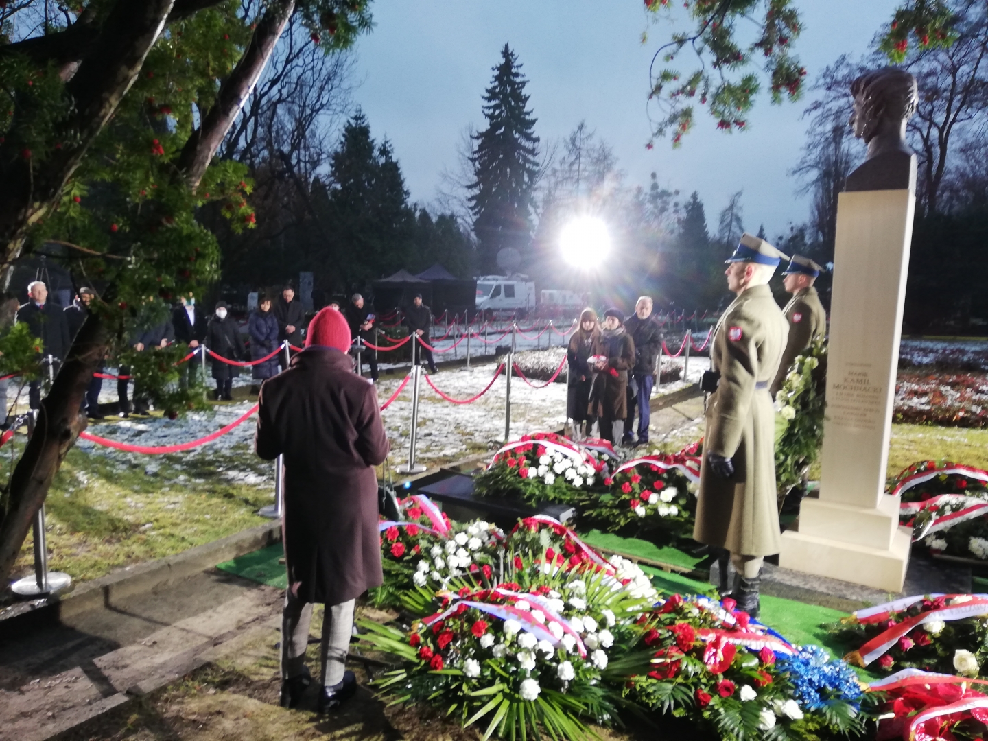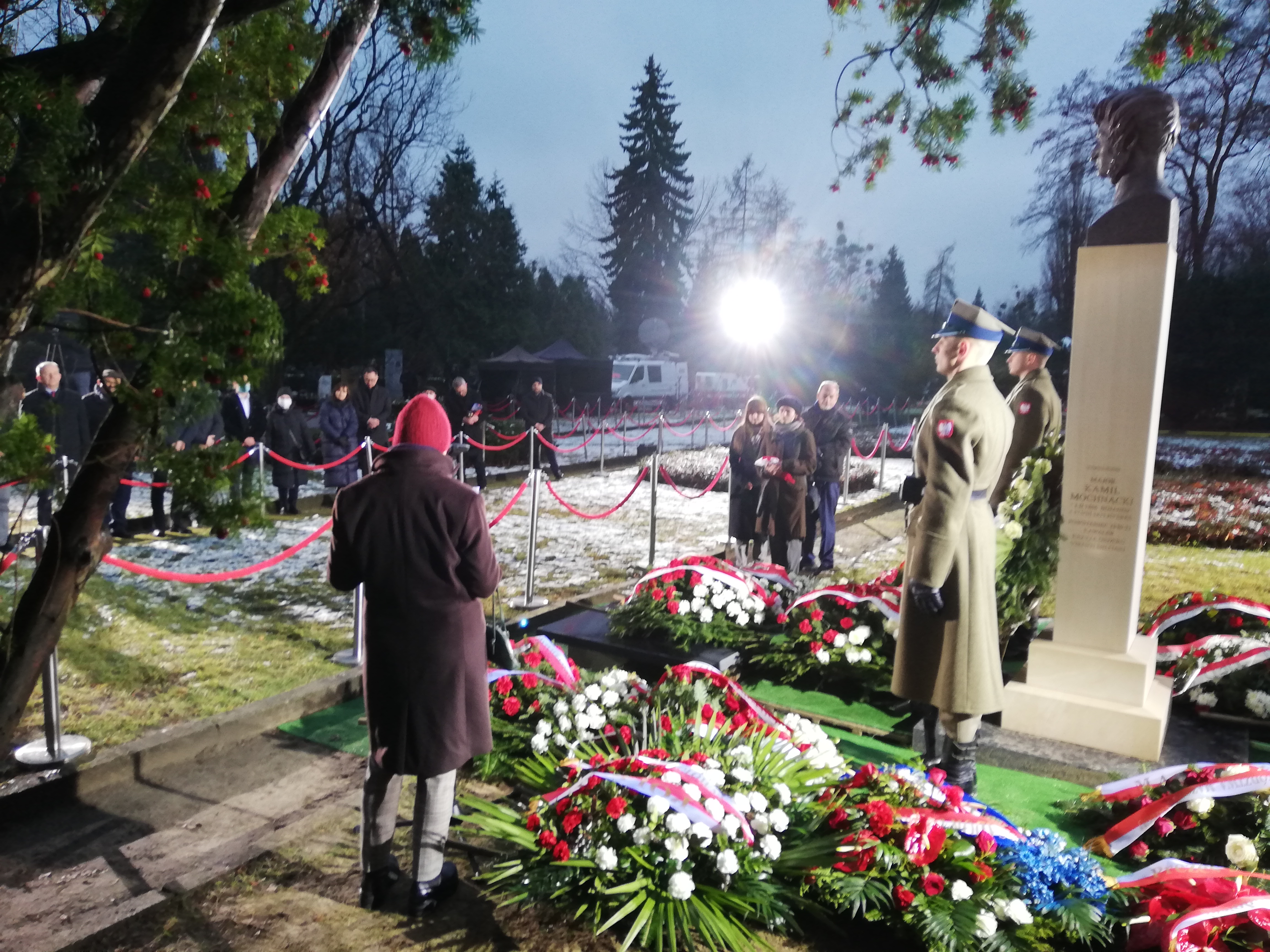 Marta Ławacz, potomkini Tymoleona Mochnackiego, przemawia po pogrzebie jego brata - Maurycego Mochnackiego, na Cmentarzu Wojskowym na Powązkach w Warszawie, w sobotę, 27 listopada 2021. Na bocznej ścianie cokołu widoczna inskrypcja poświęcona Kamilowi Mochnackiemu, trzeciemu z braci Mochnackich, który wraz z Maurycym walczył w Powstaniu Listopadowym i wojnie z Rosją 1831 r., razem z Maurycym uszedł na emigrację do Francji, i tak jak Maurycy tam zmarł. Jest to grób symboliczny Kamila.