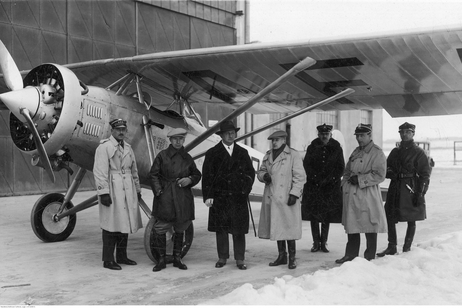 Kapitan Stanisław Skarżyński (2. z lewej) w towarzystwie nierozpoznanych osób, na tle samolotu PZL Ł.2.