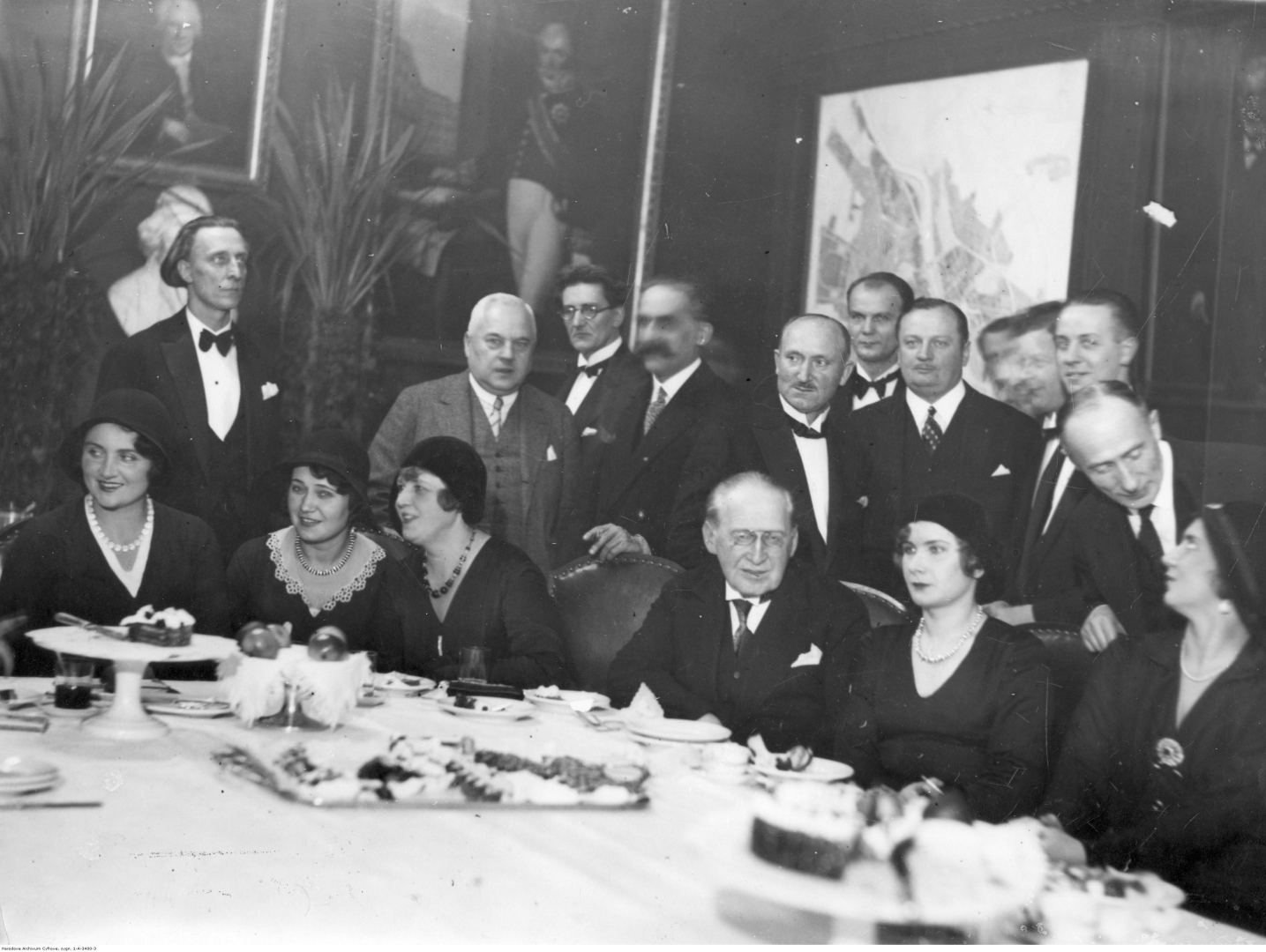 Widoczni m.in. aktorka Leokadia Pancewicz-Leszczyńska (siedzi, 1. z lewej), redaktor Bernard Szarlitt (stoi w środku, z dużymi wąsami), śpiewak Stanisław Gruszczyński (stoi z prawej w krawacie w kropki), członek Rady Miejskiej m.st. Warszawy Jerzy Michalski (stoi 2. z lewej).
