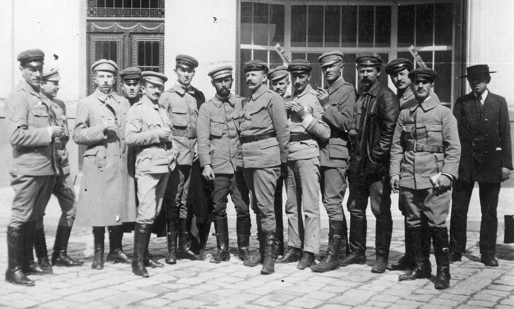 Stoją od lewej: Mikołaj Sarmat-Szyszłowski, Stanisław Sawa-Machowicz, Adam "Witold" Koc, NN, Stanisław Cavour-Urbański, Tadeusz Wyrwa-Furgalski, Edward Śmigły-Rydz, Wacław Aleksandrowicz, Zygmunt Langman, Jerzy Roja-Śladki, Bogdan Kordian-Kunc, Kostek Aleksandrowicz, Tadeusz Kuczyński, NN.
