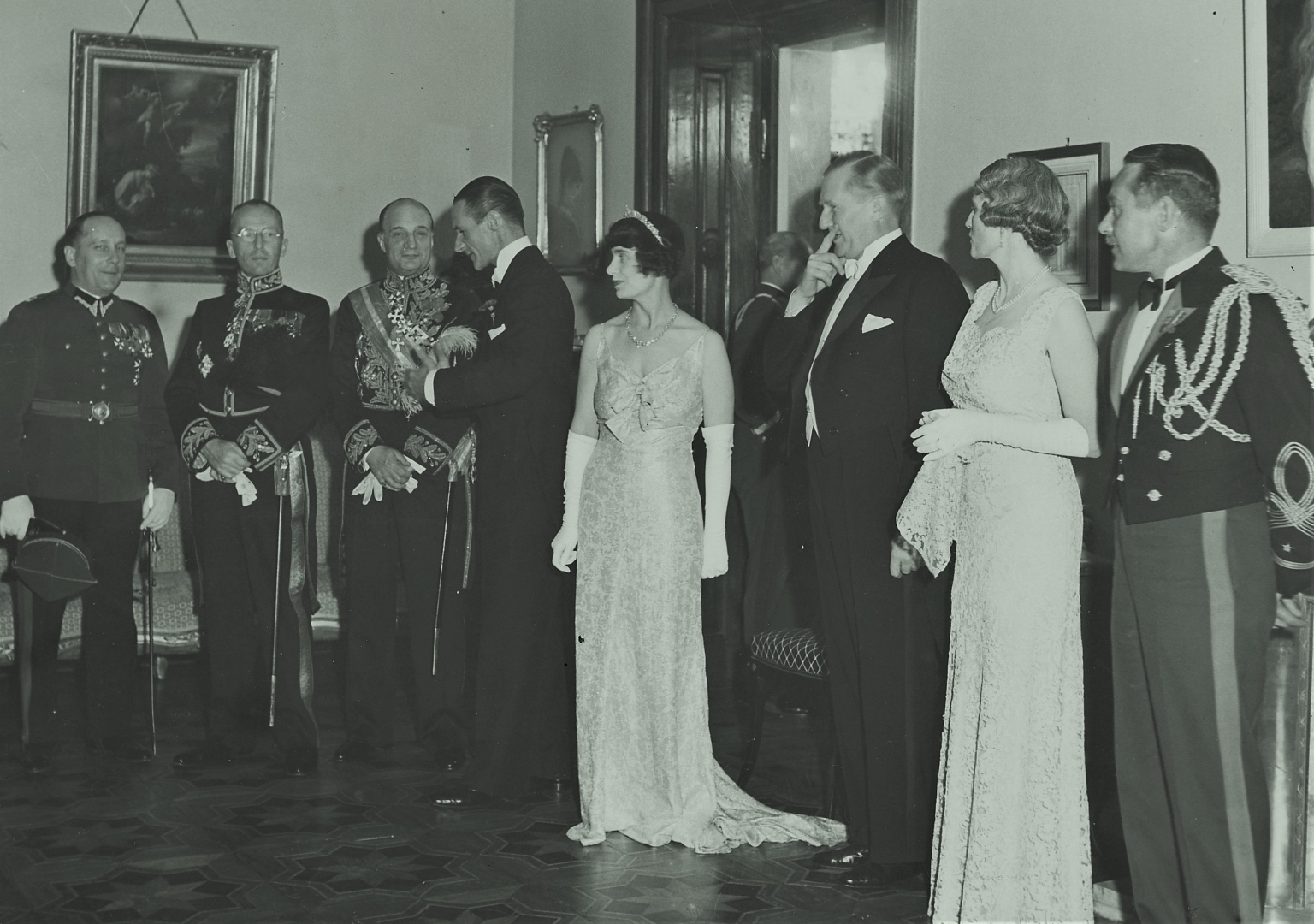 Ambasador Stanów Zjednoczonych w Polsce Anthony Drexel-Biddle (czwarty z lewej) z małżonką (piąta z lewej), szef Protokołu Dyplomatycznego MSZ Karol Romer (trzeci z lewej), zastępca szefa Protokołu Dyplomatycznego MSZ Aleksander Łubieński (drugi z lewej), zastępca szefa Gabinetu Ministra Spraw Wojskowych mjr Adam Skałkowski, radca Ambasady Stanów Zjednoczonych w Polsce Johnson (trzeci z prawej) oraz attache wojskowy Ambasady Stanów Zjednoczonych w Polsce mjr Winslow (pierwszy z prawej) w oczekiwaniu na przybywających gości.