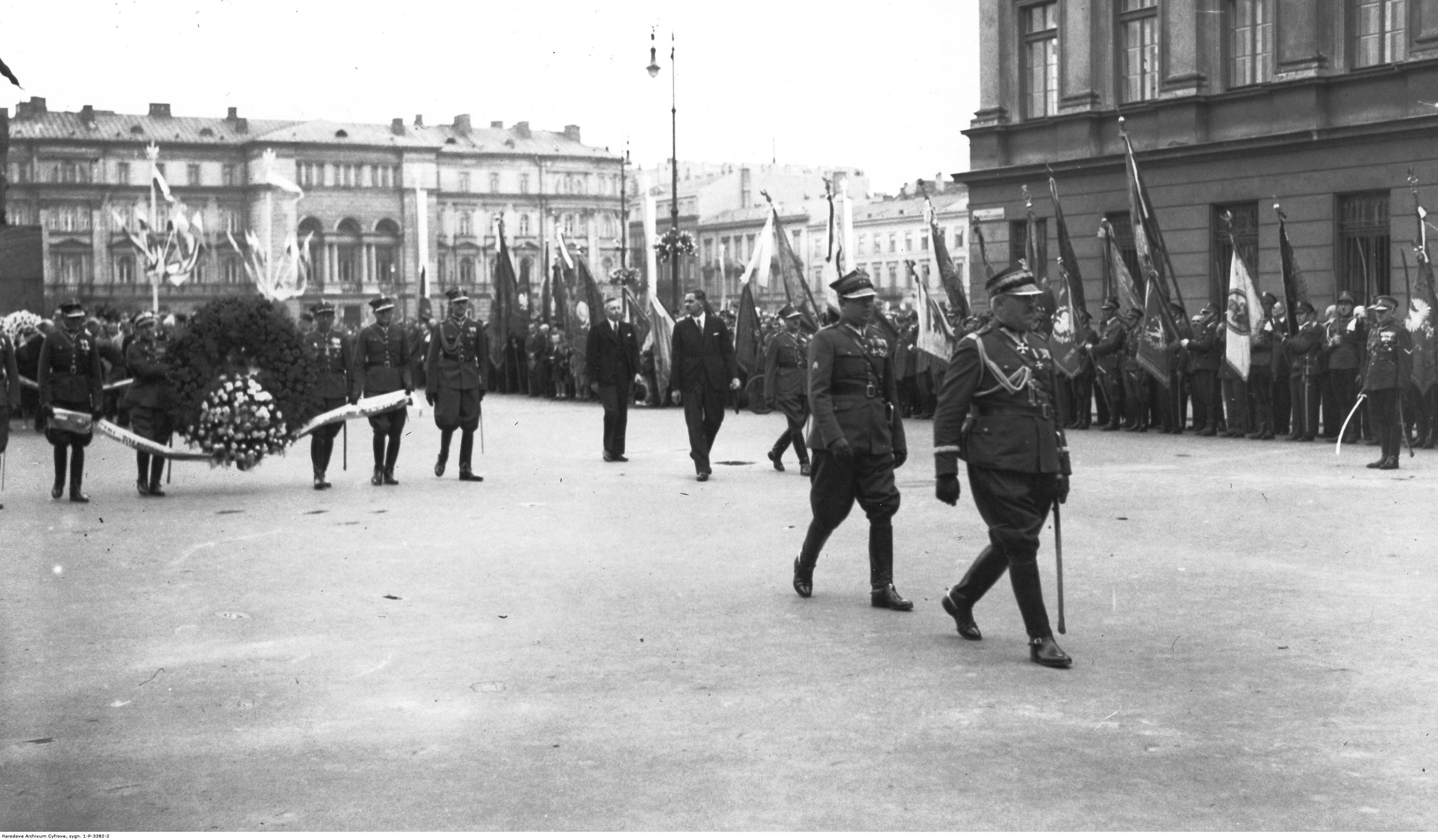 Składanie wieńca na Grobie Nieznanego Żołnierza przez delegację wojska. Na pierwszym planie gen. Henryk Krok-Paszkowski. Za nim idzie ppłk Edward Czuruk.