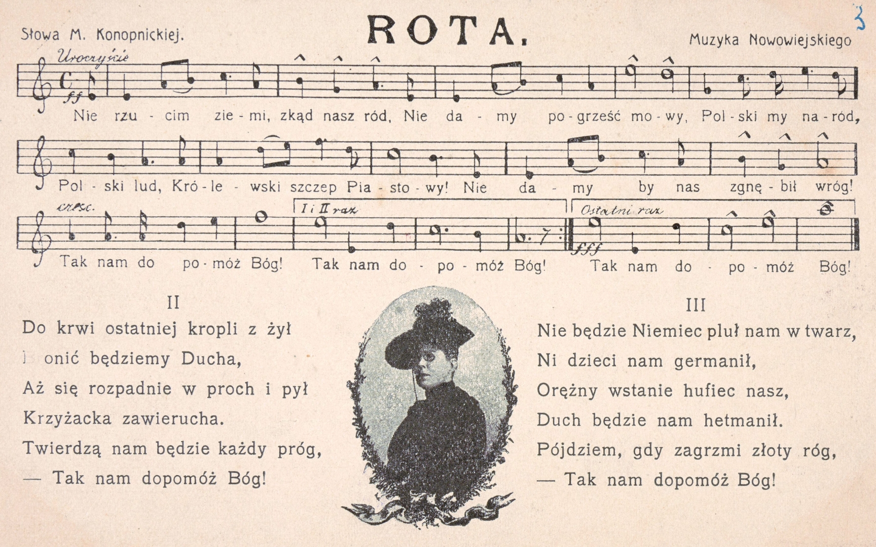 "Rota". share Podziel się facebook google + twitter linkedin clipboard envelope print quote picture add × Cytowane źródła Cytowanie źródła on-line, czyli Internetowego Polskiego Słownika Biograficznego "Rota"., [online] Warszawa: Narodowy Instytut Audiowizualny [dostęp 28.02.2026]. Dostępny w internecie: http://www.biogramy.pl/a/foto/rota Cytowanie wydania drukowanego, czyli Polskiego Słownika Biograficznego , "Rota"., [w:] Polski słownik biograficzny, t. , IPSBID: ipsb-fo-102271 × Wyślij link do strony E-mail odbiorcy wiadomości: To pole jest wymaganeWpisz poprawny adres e-mail Twój adres e-mail: To pole jest wymaganeWpisz poprawny adres e-mail Podgląd wiadomości, która zostanie wysłana: Witaj, [Tutaj podany Twój e-mail] poleca Ci treść z iPSB (internetowym Polskim Słowniku Biograficznym) "Rota". × Dodaj do kolekcji wybierz kolekcję, do której chcesz dodać ten artykuł: lub wpisz nazwę nowej kolekcji, do której chcesz dodać ten artykuł: : To pole jest wymagane Dodaj do kolekcji Wybierz kolekcję Swoje kolekcje znajdziesz w profilu. Wystarczy kliknąć ikonę zębatego koła w górnym prawym rogu. Możesz je zobaczyć tu: moje kolekcje. × Dodaj do kolekcji Element został dodany do Twojej kolekcji. Swoje kolekcje możesz zobaczyć tu: moje kolekcje. × Dodaj do kolekcji Aby dodawać materiały do kolekcji musisz się zalogować. OPIS POSTACI POWIąZANE Pocztówka z wierszem i portretem Marii Konopnickiej oraz nutami Feliksa Nowowiejskiego, wydana w Wilnie w latach 1908-1916. Postaci powiązane Feliks Nowowiejski 1877-02-07 - 1946-01-18 kompozytor Maria Stanisława Konopnicka (z domu Wasiłowska) 1842-05-23 - 1910-10-08 poetka więcej >> Zobacz zdjęcie w najwyższej jakości Źródło