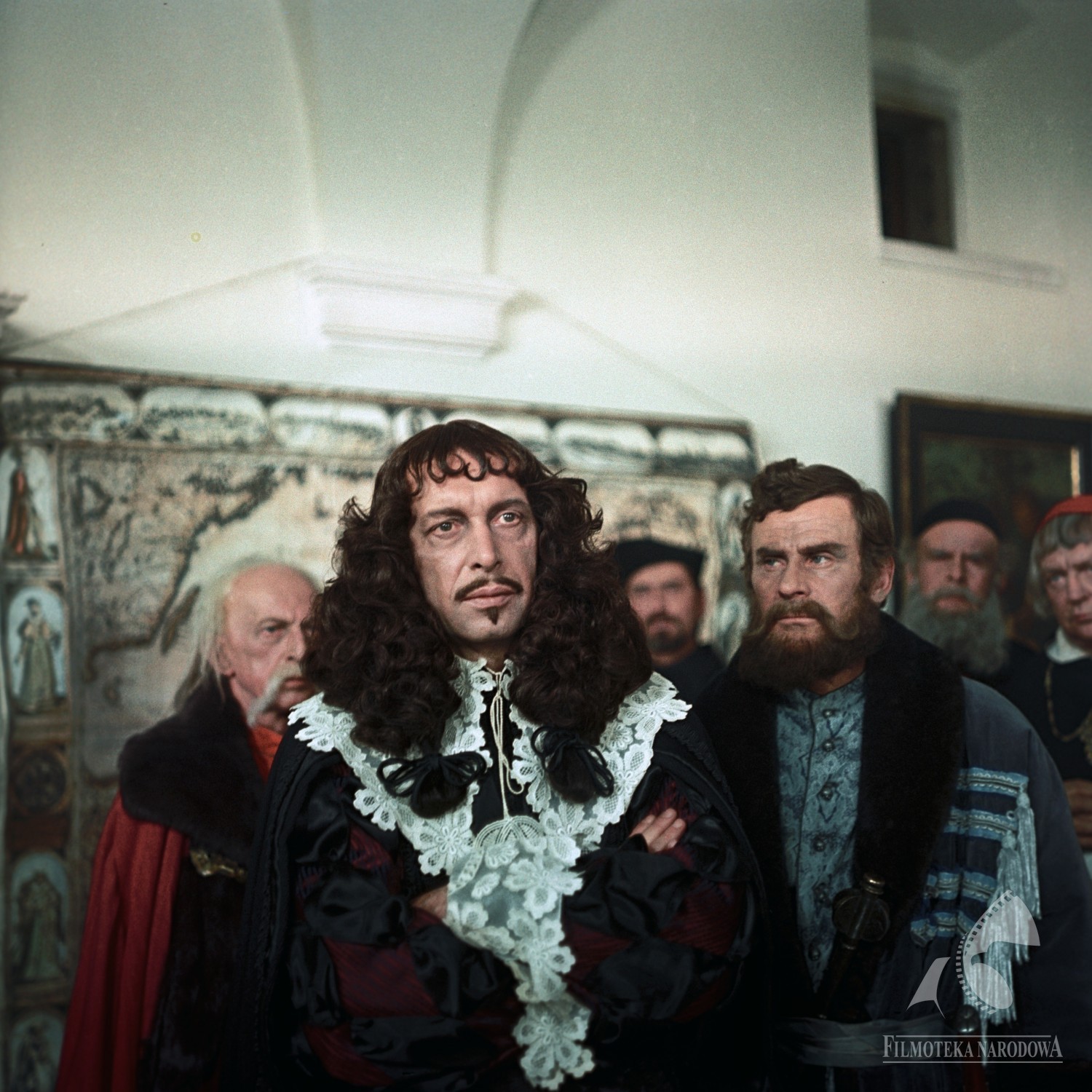 Na zdjęciu widoczni są aktorzy: Hugo Krzyski (z lewej, z tyłu), Piotr Pawłowski (w roli króla Jana II Kazimierza), Witold Skaruch (w środku, w tle), Wiesław Gołas (w roli Stefana Czarnieckiego), Aleksander Gąssowski (z prawej, w roli duchownego), Euzebiusz Luberadzki (drugi z prawej).