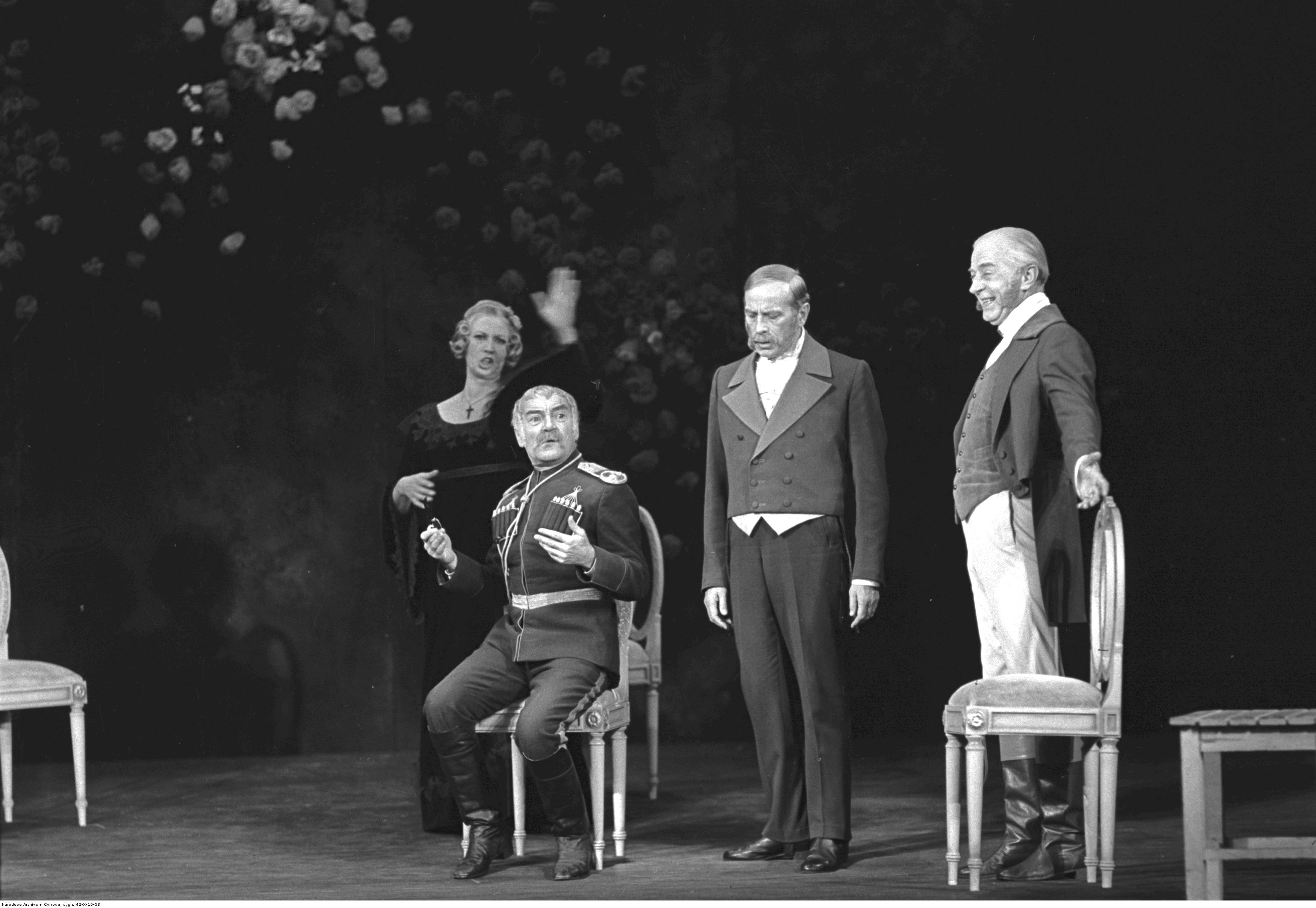 Na zdjęciu widoczni aktorzy (od lewej): Halina Kossobudzka (Hrabina Respektowa), Ignacy Machowski (Wołdemar Hawryłowicz, rodem Czerkies, stary major rosyjski), Jerzy Kaliszewski (Hrabia Respekt marszałek powiatowy) i Jan Świderski (Rzecznicki, marszałek powiatowy).
