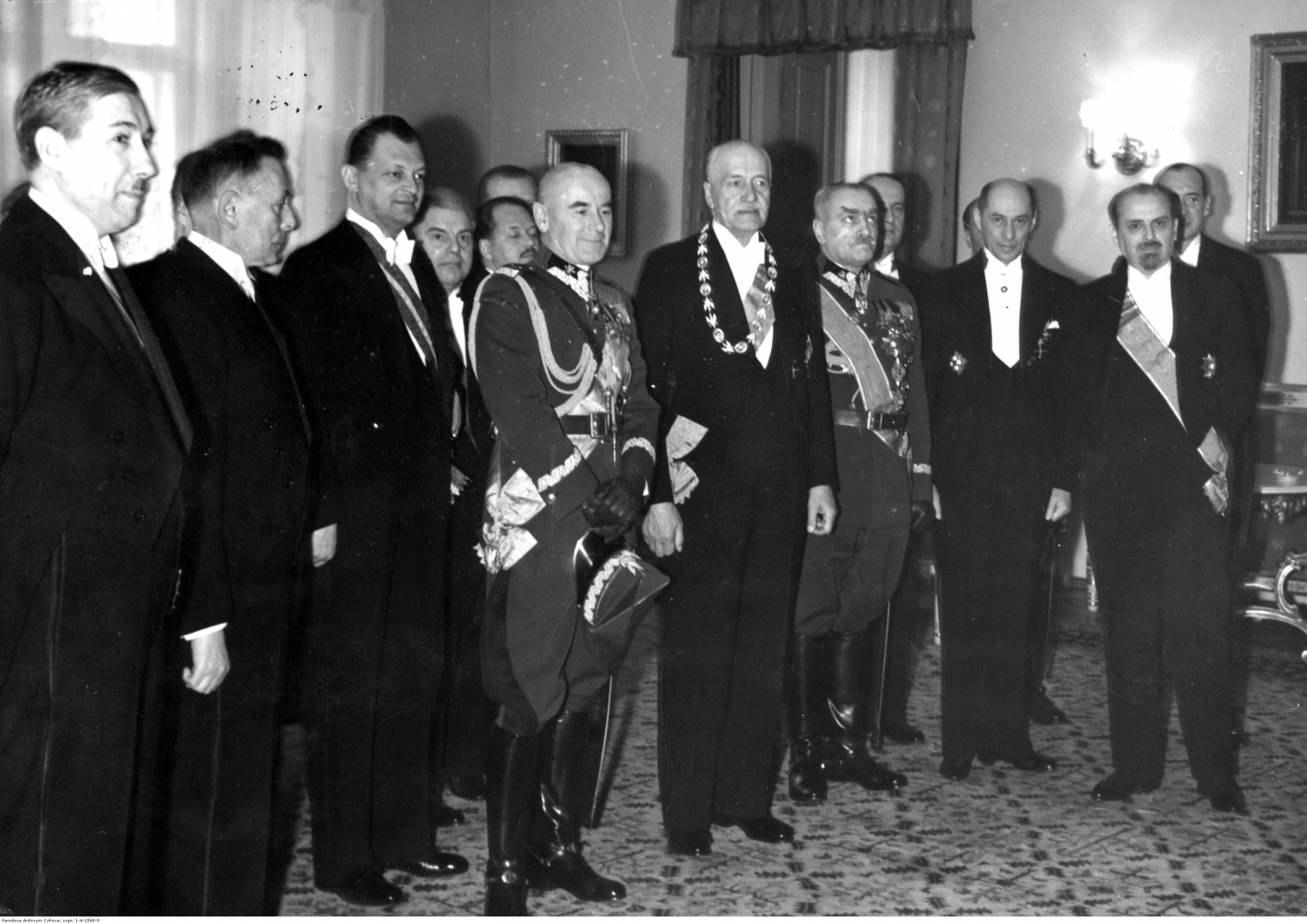 Prezydent RP Ignacy Mościcki w otoczeniu przedstawicieli rządu, sejmu i senatu. Widoczni m.in. marszałek Polski Edward Rydz-Śmigły, premier Felicjan Sławoj Składkowski, wicepremier Eugeniusz Kwiatkowski, minister sprawiedliwości Witold Grabowski, wicemarszałek sejmu Bogusław Miedziński, wicemarszałek senatu Wacław Makowski.
