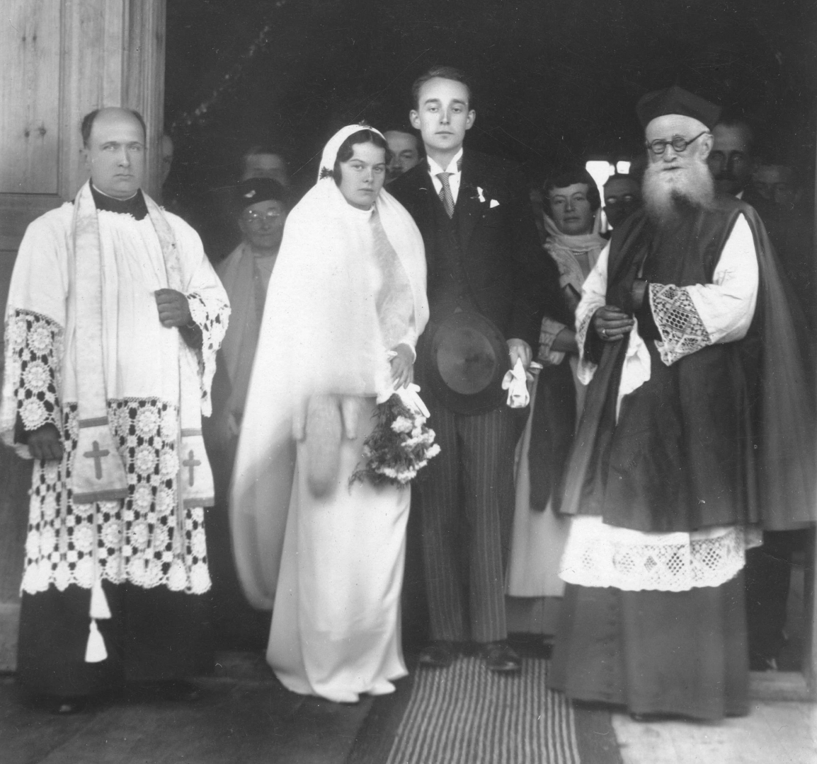 Para młoda po ceremonii zaślubin w towarzystwie wuja pani młodej arcybiskupa Edwarda Roppa (z prawej) i proboszcza Barszczewskiego w drzwiach kościoła.