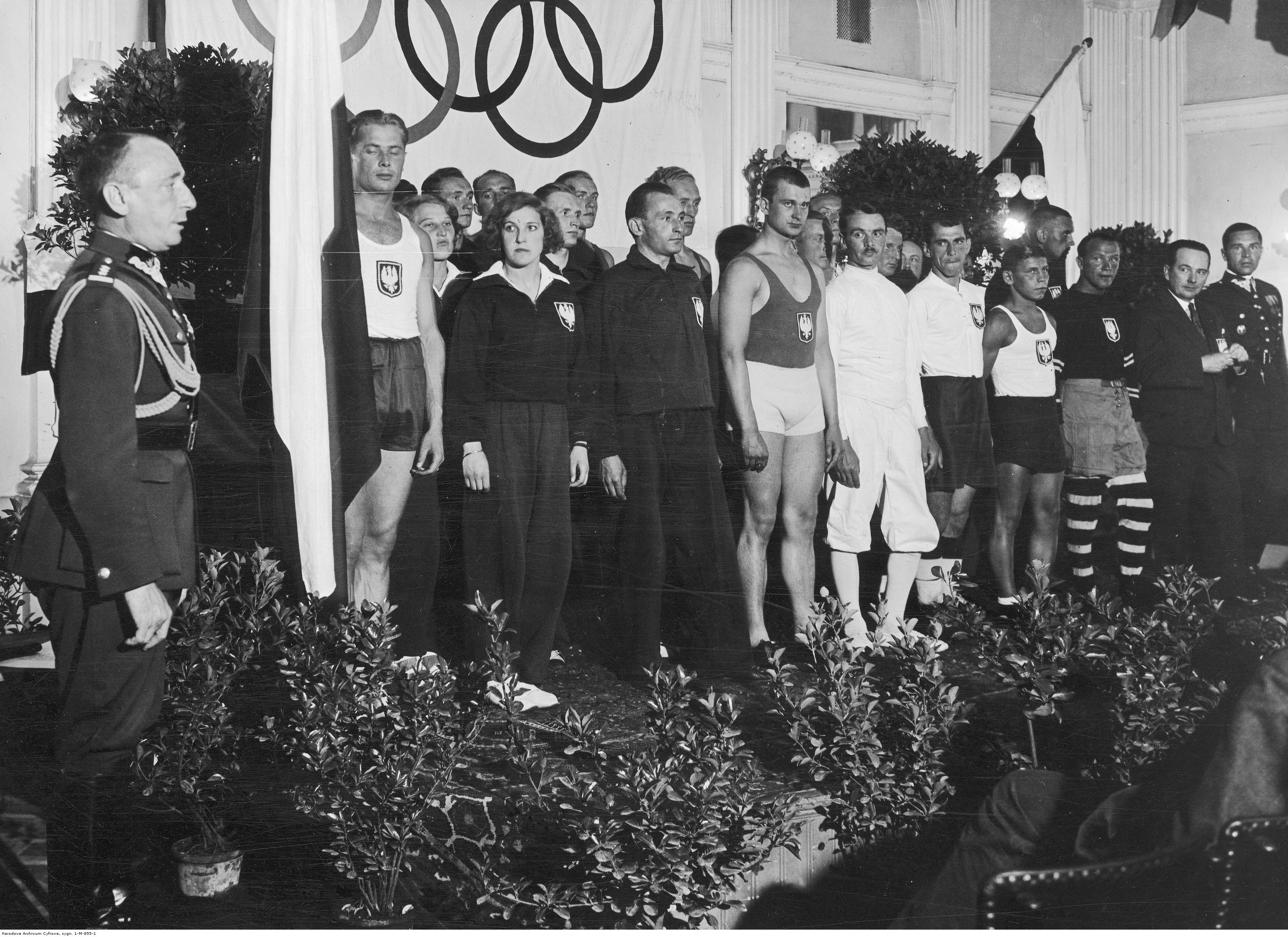 Sportowcy podczas ślubowania w obecności prezesz Polskiego Komitetu Olimpijskiego pułkownika Kazimierza Glabisza. Widoczni m.in.: Jerzy Pławczyk, Maria Kwaśniewska, Jadwiga Wajsówna.