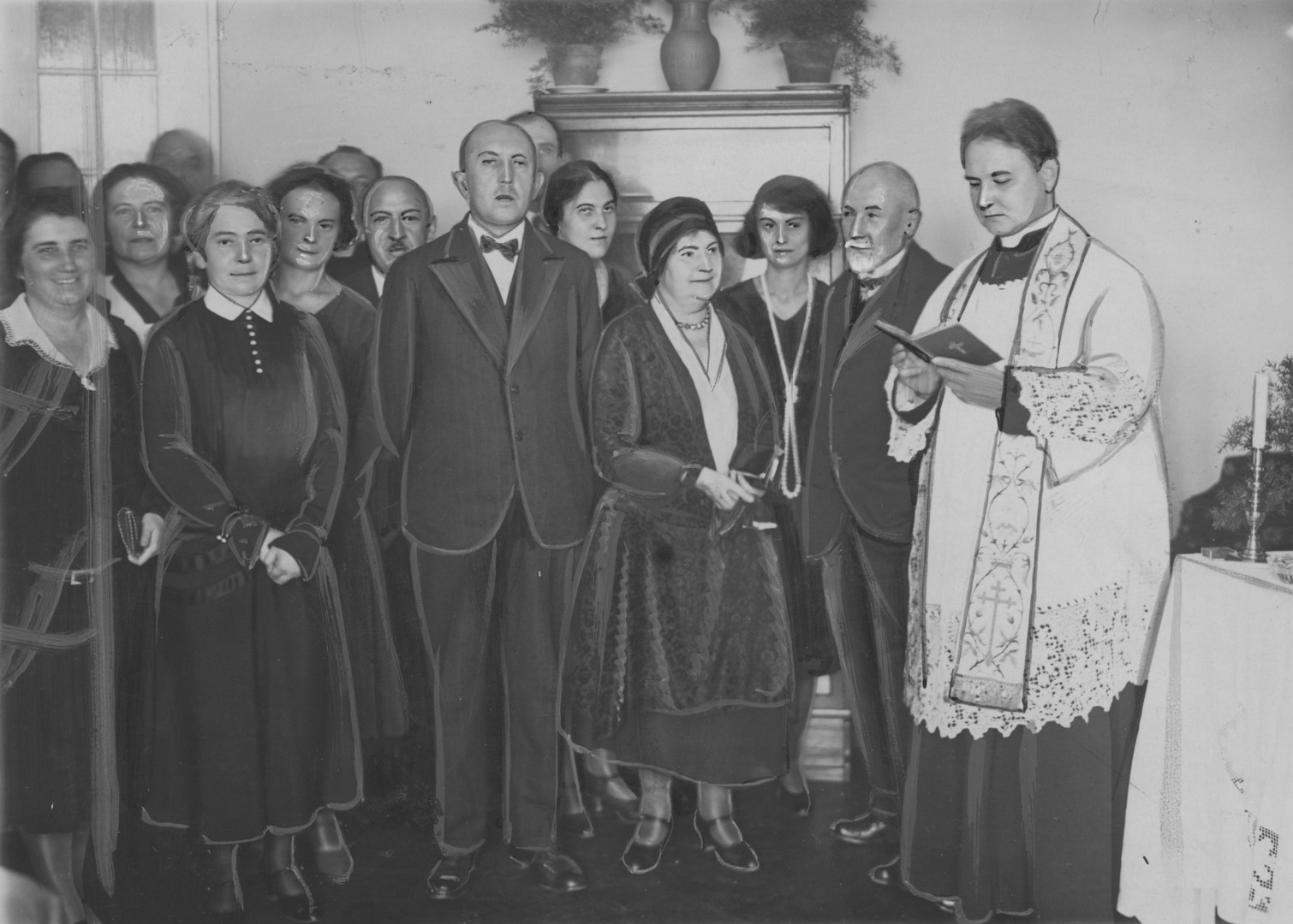 Ksiądz Franciszek Forecki dokonuje poświęcenia lokalu. Od lewej widoczni również: wizytatorka szkół zawodowych żeńskich Madurowiczówna (2 z lewej), kurator poznańskiego okręgu szkolnego dr Joachim Namysł (w środku), kierowniczka Poradni Zawodowej Helena Dachówna (5 z prawej), naczelniczka wydziału szkół handlowych i gospodarczych departamentu szkolnictwa zawodowego ministerstwa Wyznań Religijnych i Oświecenia Publicznego Maria Zaborowska (4 z prawej), kierowniczka centrali poradni zawodowych dla dziewcząt w Warszawie Kączkowska (3 z prawej), były kurator Bernard Chrzanowski (2 z prawej).