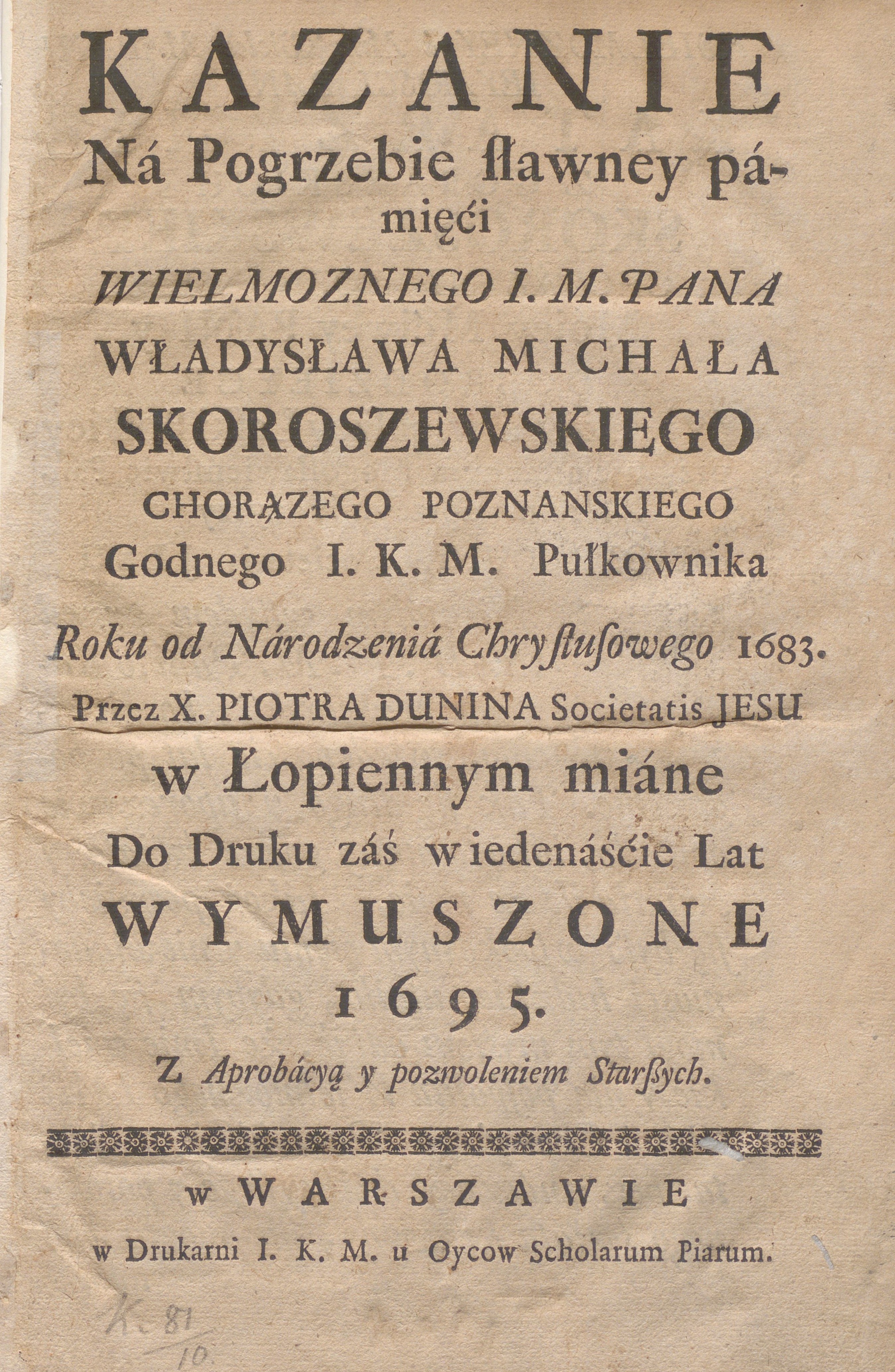 , Strona tytułowa druku z kazaniem na pogrzebie Władysława Michała Skoraszewskiego (Skoroszewskiego)., [w:] Polski słownik biograficzny, t. ,