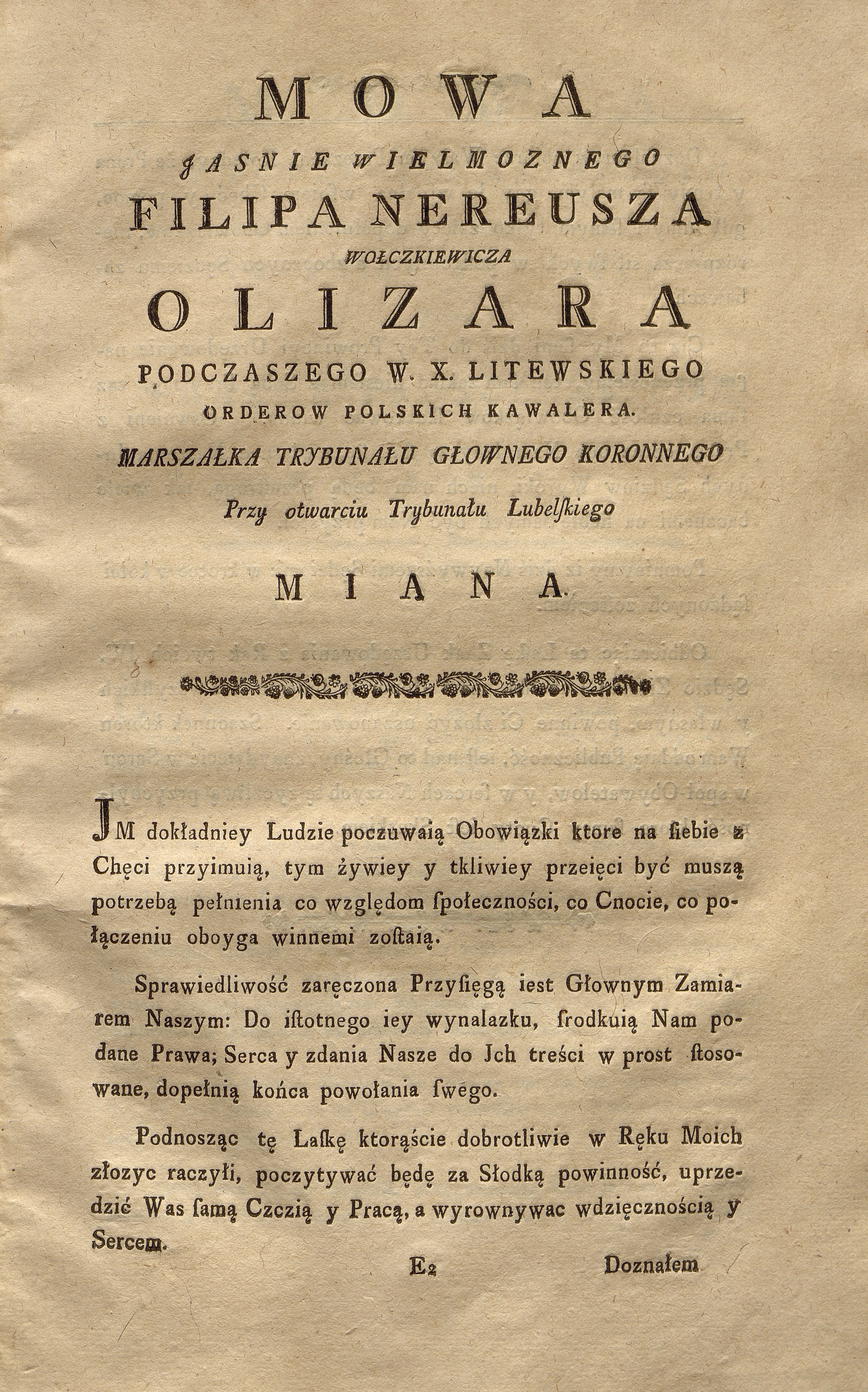 "Mowa / Jaśnie Wielmożnego / Filipa Nereusza / Wołczkiewicza / Olizara / Podczaszego W. X. Litewskiego / Orderów Polskich Kawalera / Marszałka Trybunału Głównego Koronnego / Przy otwarciu Trybunału Lubelskiego / Miana".