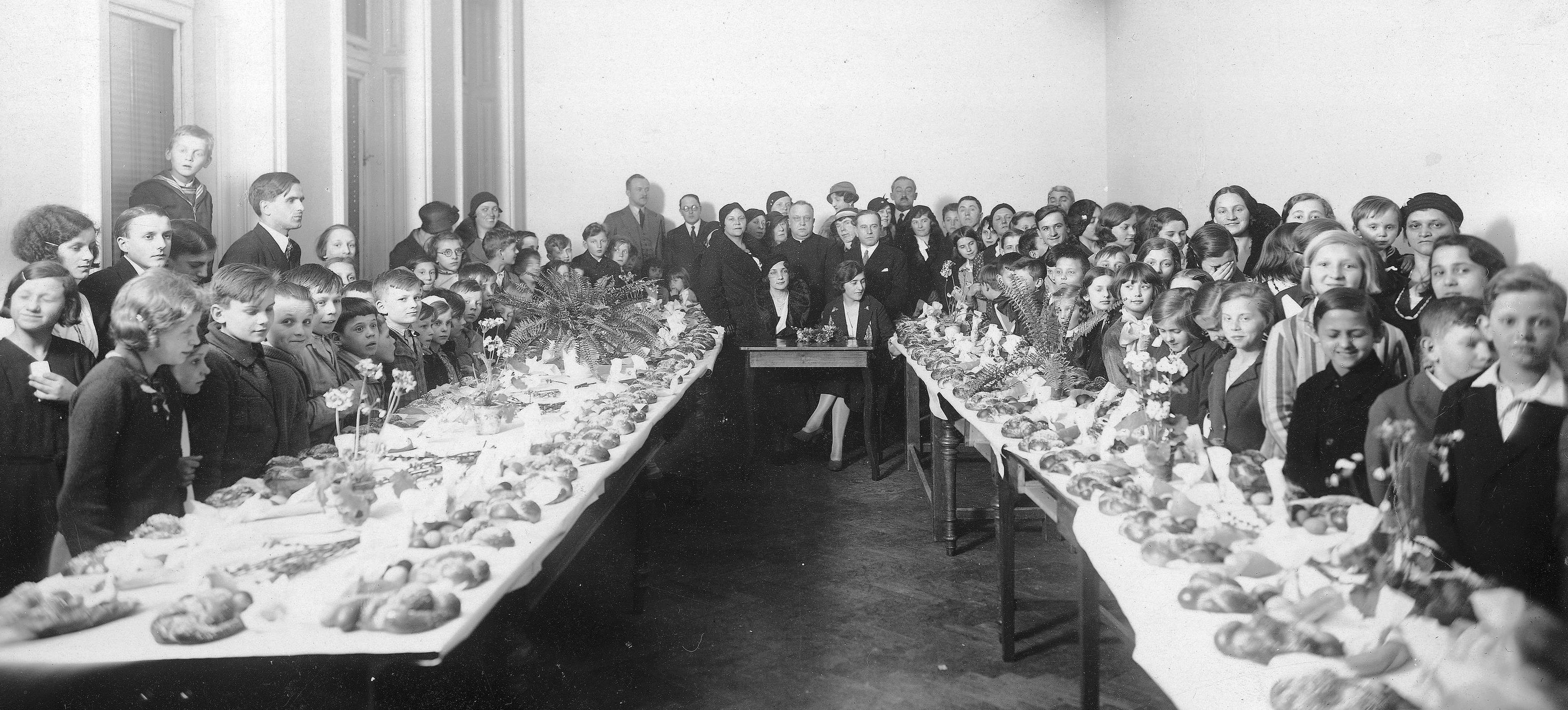 Widoczni m.in.: żona konsula Aleksandra Dunajeckiego (siedzi pośrodku z prawej), konsul generalny RP w Wiedniu Aleksander Dunajecki (stoi za żoną), Helena Mościcka (siedzi pośrodku z lewej), rektor kościoła polskiego w Wiedniu ksiądz Stanisław Skwierawski (stoi za H. Mościcką).