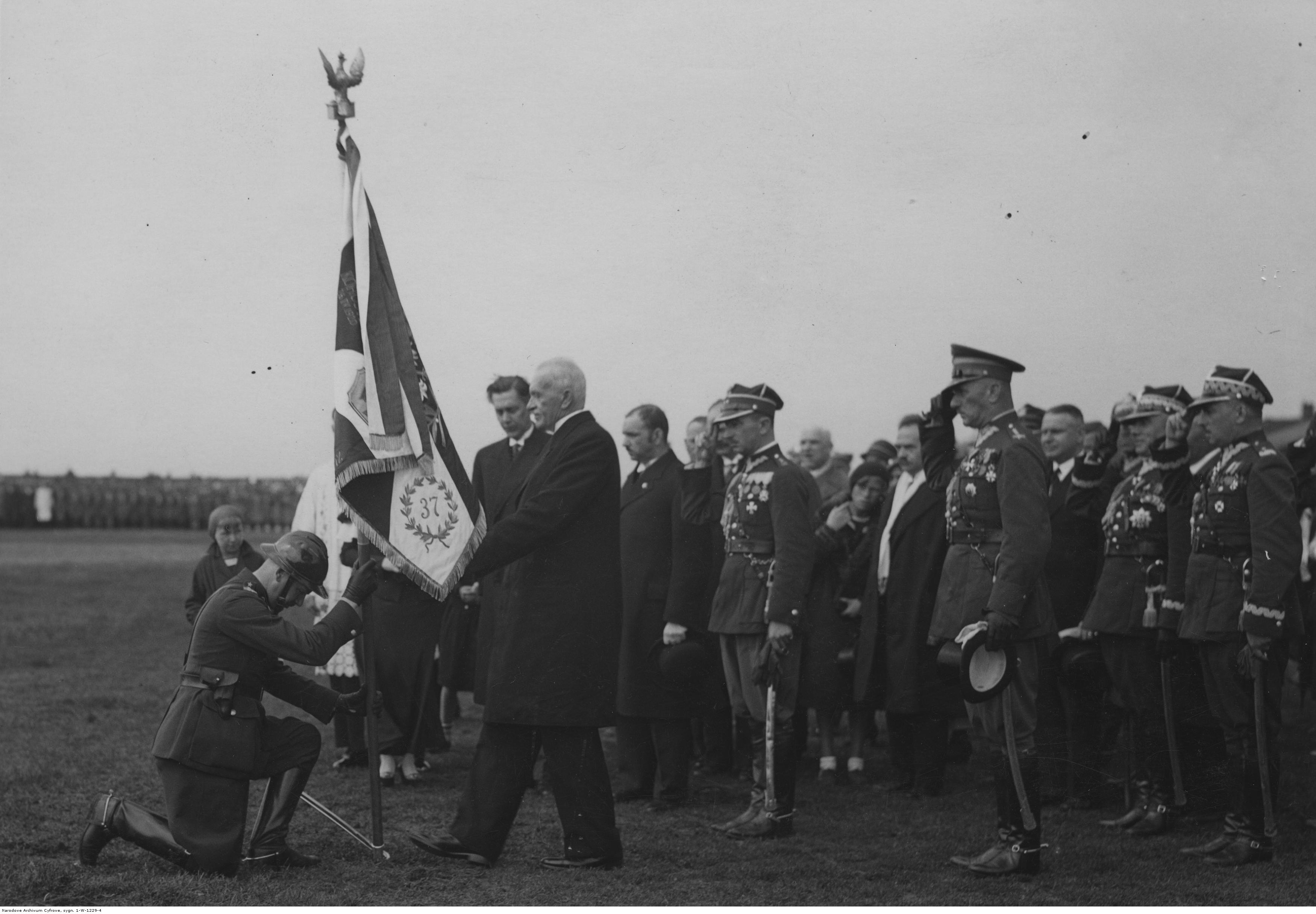 Prezydent Ignacy Mościcki wręcza sztandar płk. Józefowi Sas-Hoszowskiemu. Widoczni także wojewoda łódzki Aleksander Hauke-Nowak (z lewej za prezydentem), starosta łęczycki Zygmunt Pajdak (z prawej za prezydentem), płk Jan Głogowski (z cylindrem prezydenta), gen. Stanisław Nałęcz-Małachowski (1. z prawej), por. Władysław Krotkiewski (w środku, salutuje).