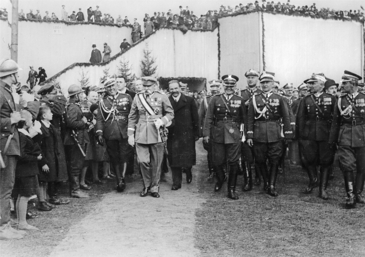 Marszałek Józef Piłsudski i wojewoda Władysław Belina-Prażmowski (w płaszczu) w otoczeniu starszych oficerów po zakończonej rewii. Widoczni m.in.: gen. Bernard Mond (na lewo od marszałka), płk Jan Karcz (1. z prawej), płk Ludwik Kmicic-Skrzyński (2. z prawej), gen. Bolesław Wieniawa-Długoszowski (3. z prawej), płk Stefan Hanka-Kulesza (4. z prawej), płk Roman Abraham (na lewo za gen. Długoszowskim)