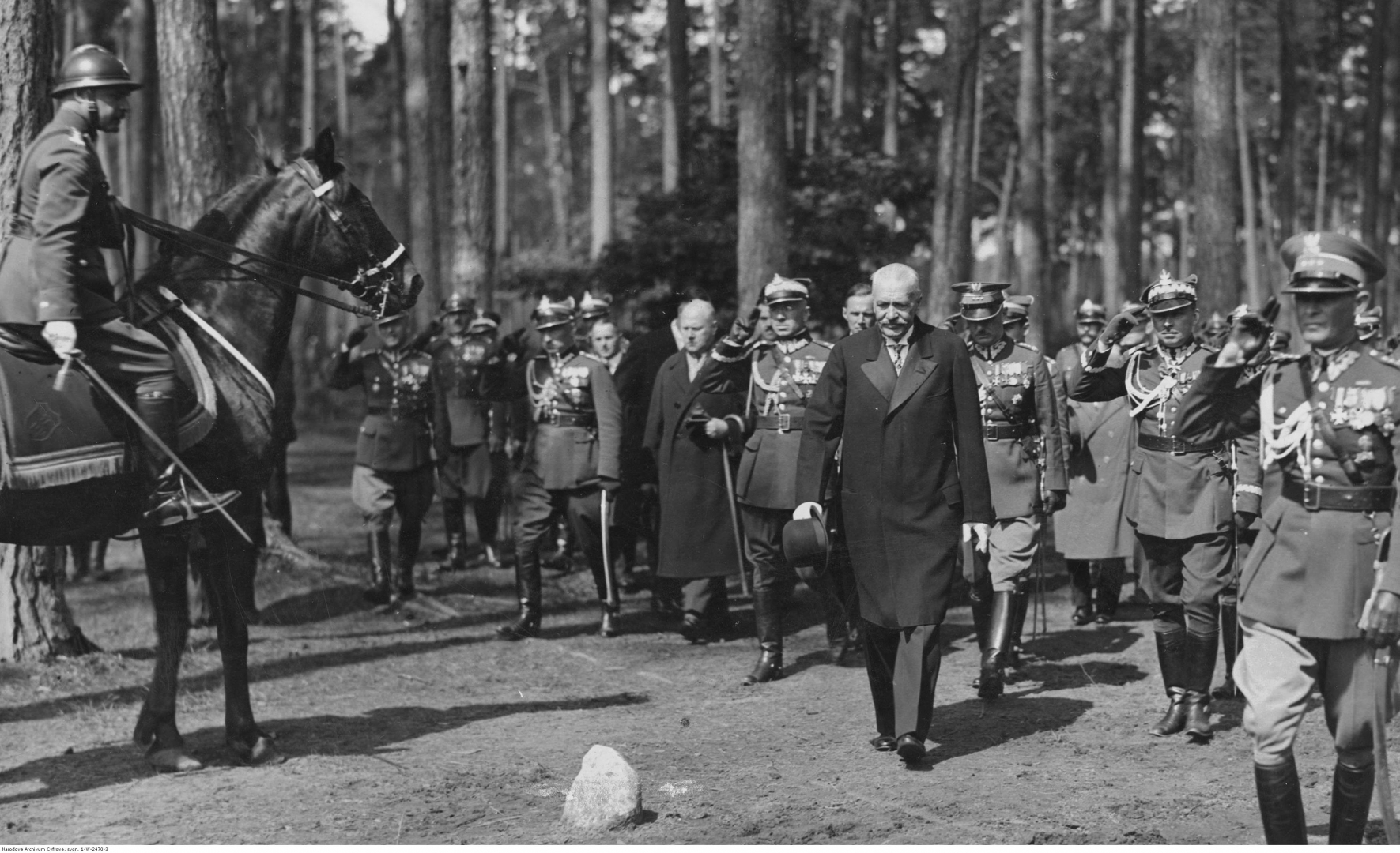 Prezydent RP Ignacy Mościcki, w towarzystwie dowódcy OK IV Łódź gen. bryg. Stanisława Nałęcz-Małachowskiego (2. z prawej), dowódcy 26 Dywizji Piechoty gen. bryg. Mieczysława Mackiewicza (z prawej prezydenta), płk. Jana Głogowskiego (za prezydentem), oraz swoich adiutantów kpt. Bolesława Suszyńskiego (3. z lewej) i rotmistrza Wacława Calewskiego (1. z prawej), przybywa do miejsca zgrupowania oddziałów przysposobienia wojskowego.