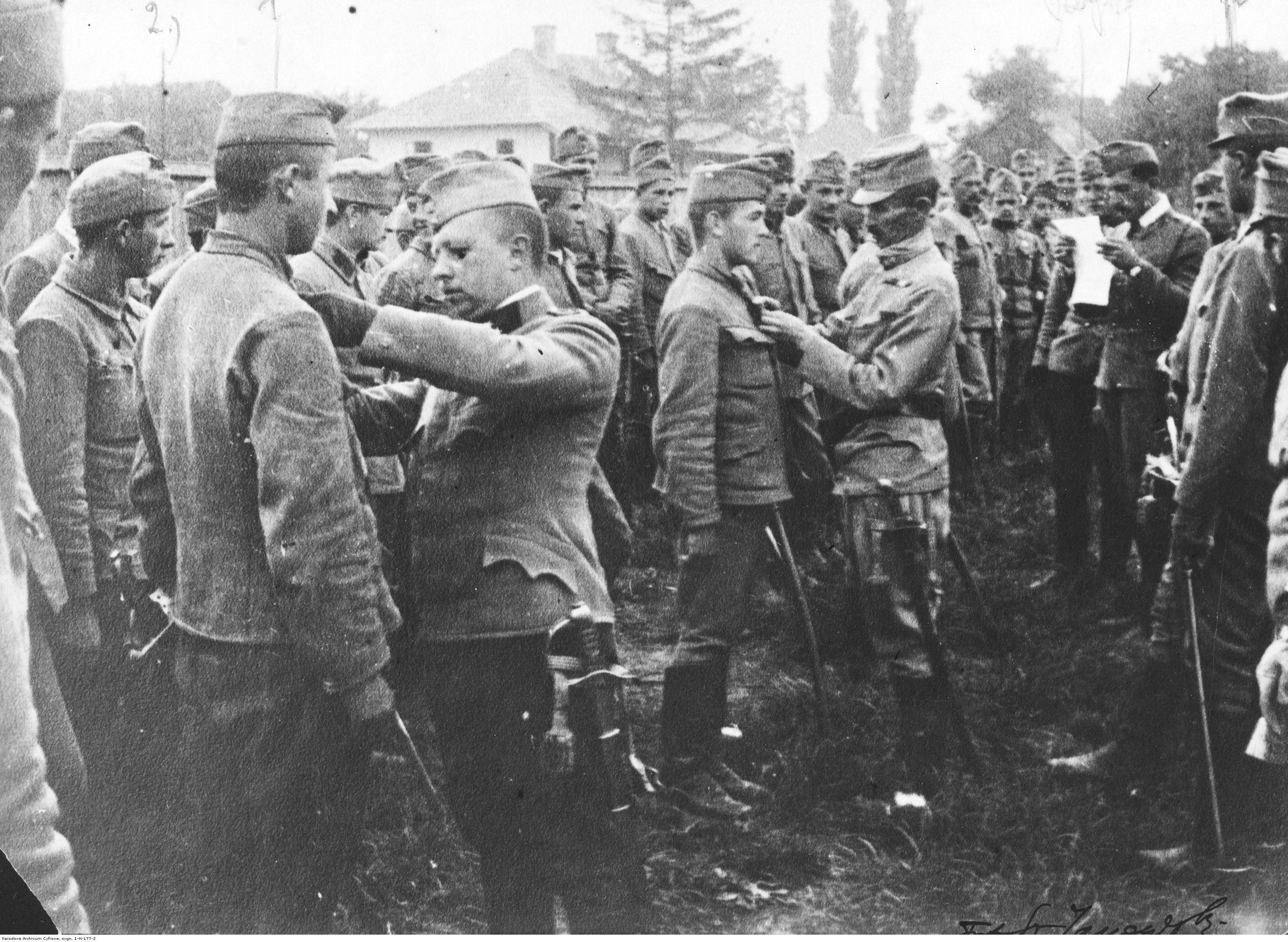 , Szarża ułanów II Brygady Legionów pod Rokitną podczas działań na froncie wschodnim - dekoracja żołnierzy po bitwie w sierpniu 1915 roku., [w:] Polski słownik biograficzny, t. ,
