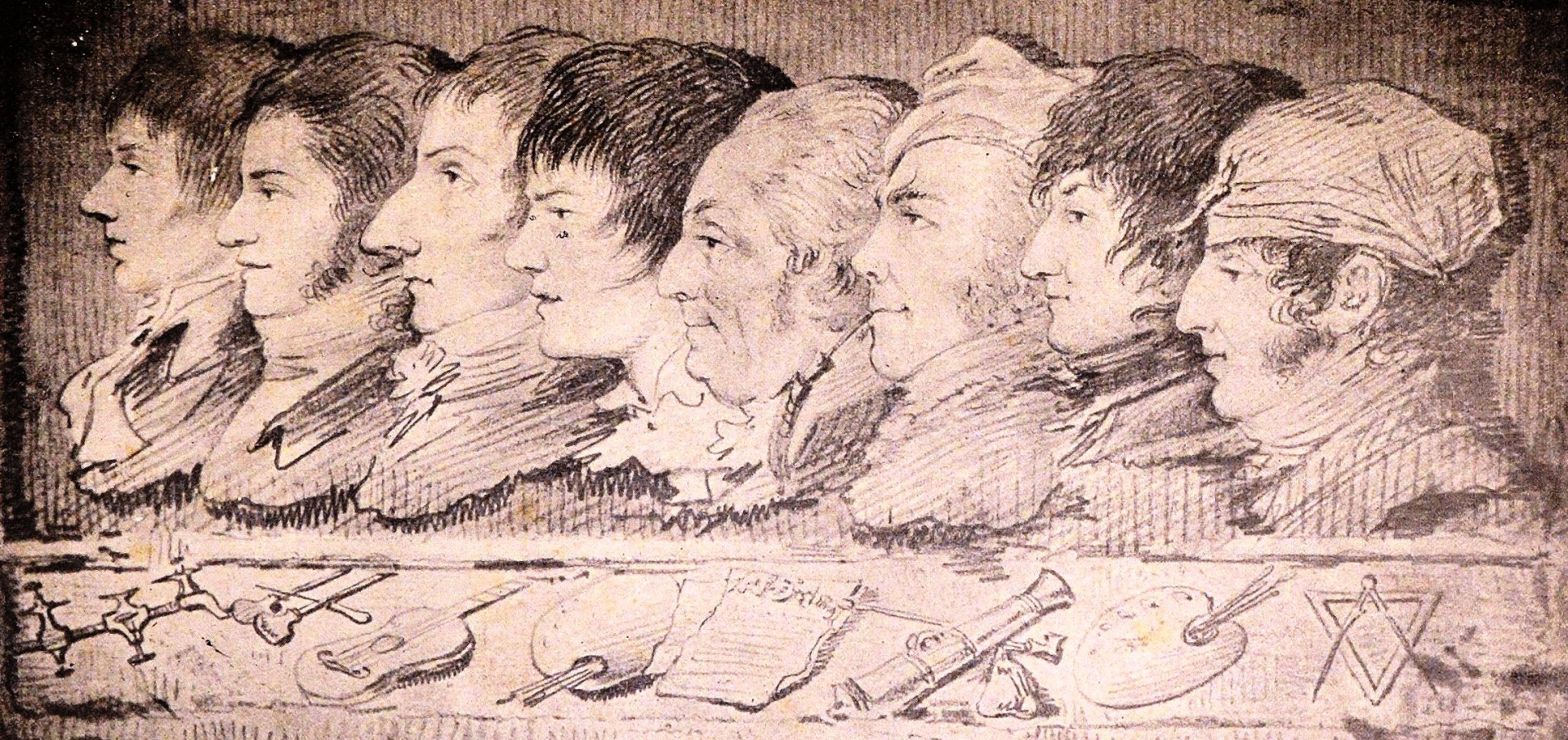 Rysunek przedstawia profile ośmiu osób (od lewej): nieznany z nazwiska zegarmistrz, rytownik Karol Gröll, profesor śpiewu i gitarzysta Manarelli, Aleksander Orłowski (autoportret rysowany z pamięci), nieznany z nazwiska Włoch, który urządził loterię na rachunek rzadu, sztycharz Falino, malarz Wojniakowski i budowniczy Itar, którego księżna H. Radziwiłłowa sprowadziła do budowy Arkadii pod Nieborowem.