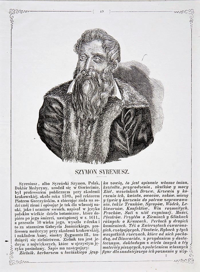 , "Szymon Syreński (Syrenius, Sacranus) (ok. 1540-1611) przyrodnik, lekarz i botanik, profesor Akademii Krakowskiej, autor "Zielnika". Strona (próbna) z wydawnictwa zwartego, zadrukowana jednostronnie"., [w:] Polski słownik biograficzny, t. ,