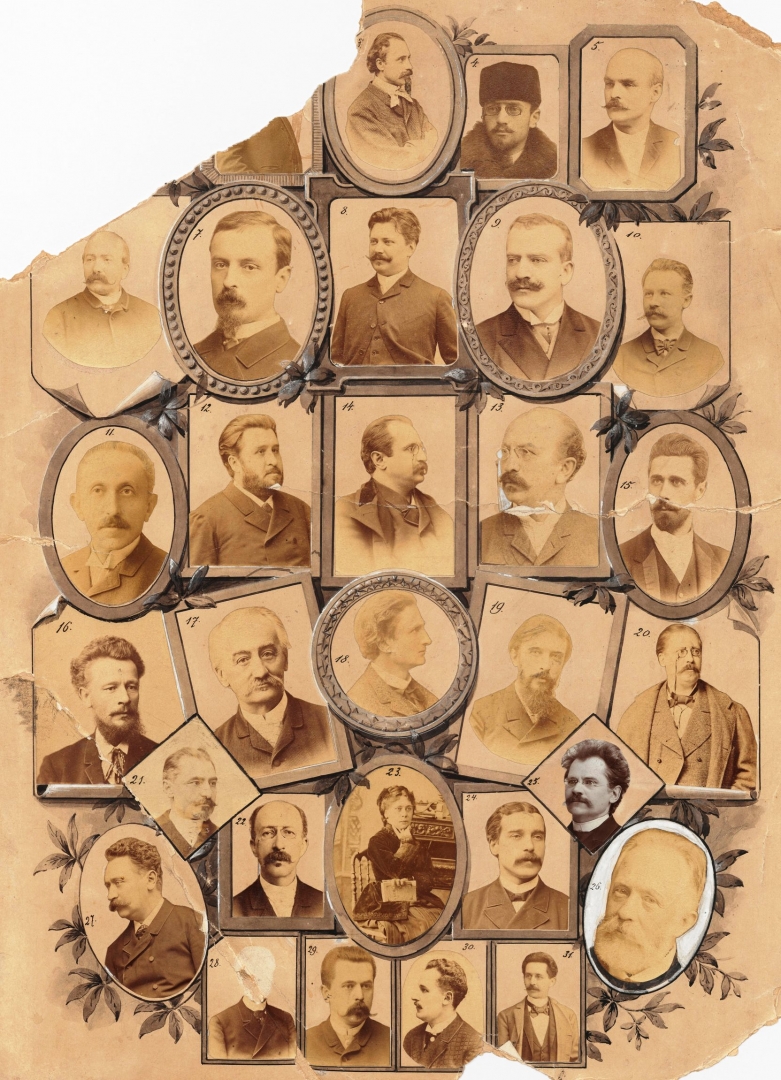 Kompozycja z 1894 roku 31 portretów [brak dwóch portretów w lewym górnym narożniku]: 1. [Leon Madeyski] - brak 2. [Aleksander Mańkowski] - brak 3. Felicjan Faleński 4. Alfred Konar 5. Teodor Jeske-Choiński 6. Julian Wieniawski 7. Henryk Sienkiewicz 8. Marian Gawalewicz 9. Zygmunt Przybylski 10. Stanisław M. Rzętkowski 11. Adolf Abrahamowicz 12. Michał Bałucki 13. Edward Lubowski 14. Kazimierz Zalewski 15. Ryszard Ruszkowski 16. Julian Adolf Święcicki 17. Ignacy Maciejowski, pseud. Sewer 18. Wincenty Rapacki 19. Aleksander Świętochowski, pseud. Władysław Okoński 20. Zygmunt Sarnecki 21. Stanisław Graybner 22. Daniel Zgliński 23. Zofia Mellerowa 24. Jan Galasiewicz 25. Kazimierz Gliński 26. Bronisław Grabowski 27. Michał Wołowski 28. Stanisław Rzewuski 29. Leopold Świderski 30. Paweł Kośmiński 31. Władysław Gutowski