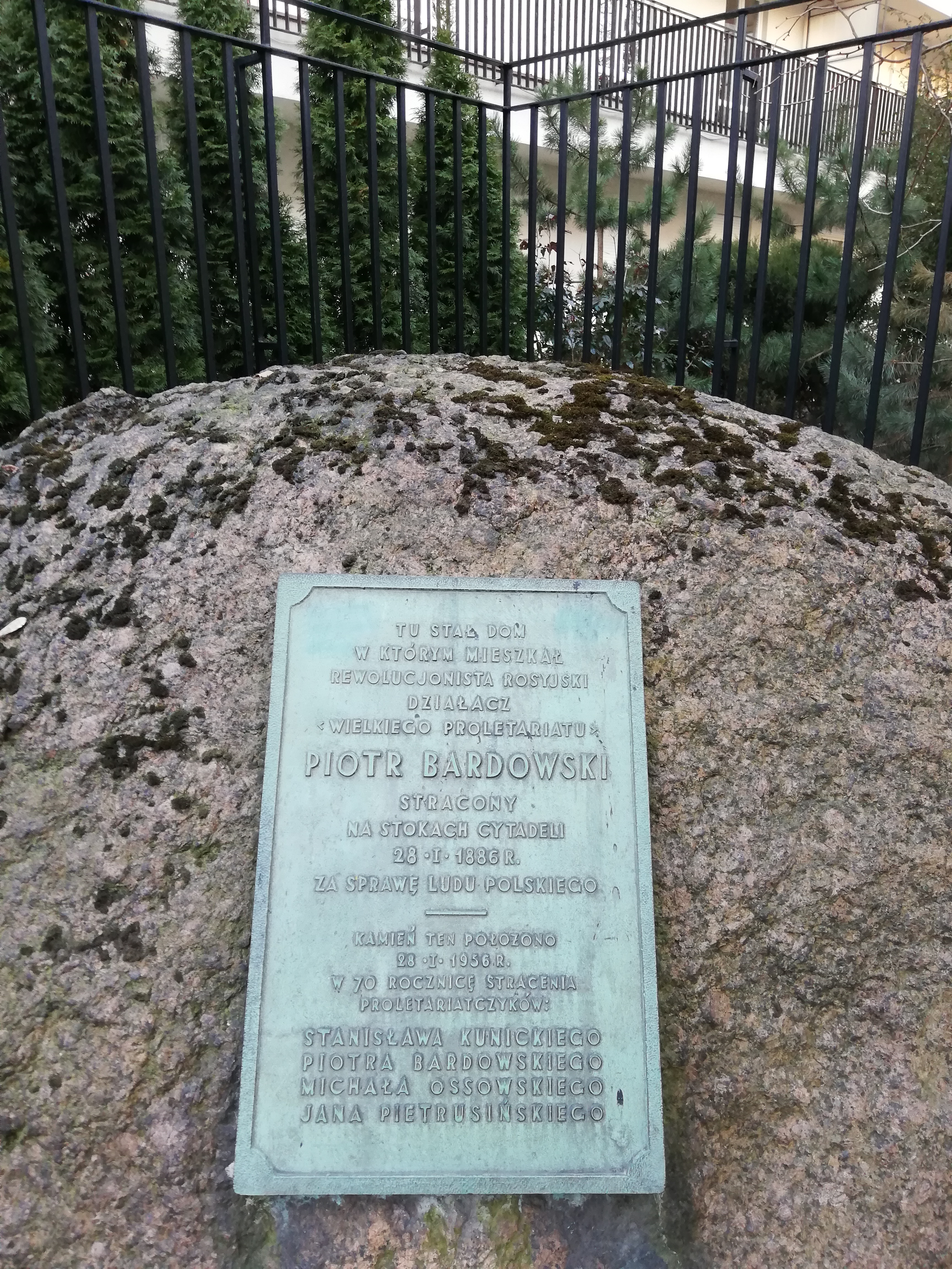Kamień z tablicą pamiątkową znajduje się nieco w głębi posesji na rogu ulic Konwiktorskiej i Zakroczymskiej w Warszawie.\