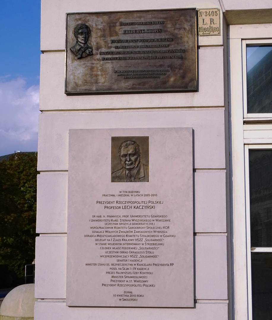 , Tablice upamiętniające prezydenta Lecha Kaczyńskiego i Fryderyka Chopina na ścianie Pałacu Prezydenckiego w Warszawie., [w:] Polski słownik biograficzny, t. ,