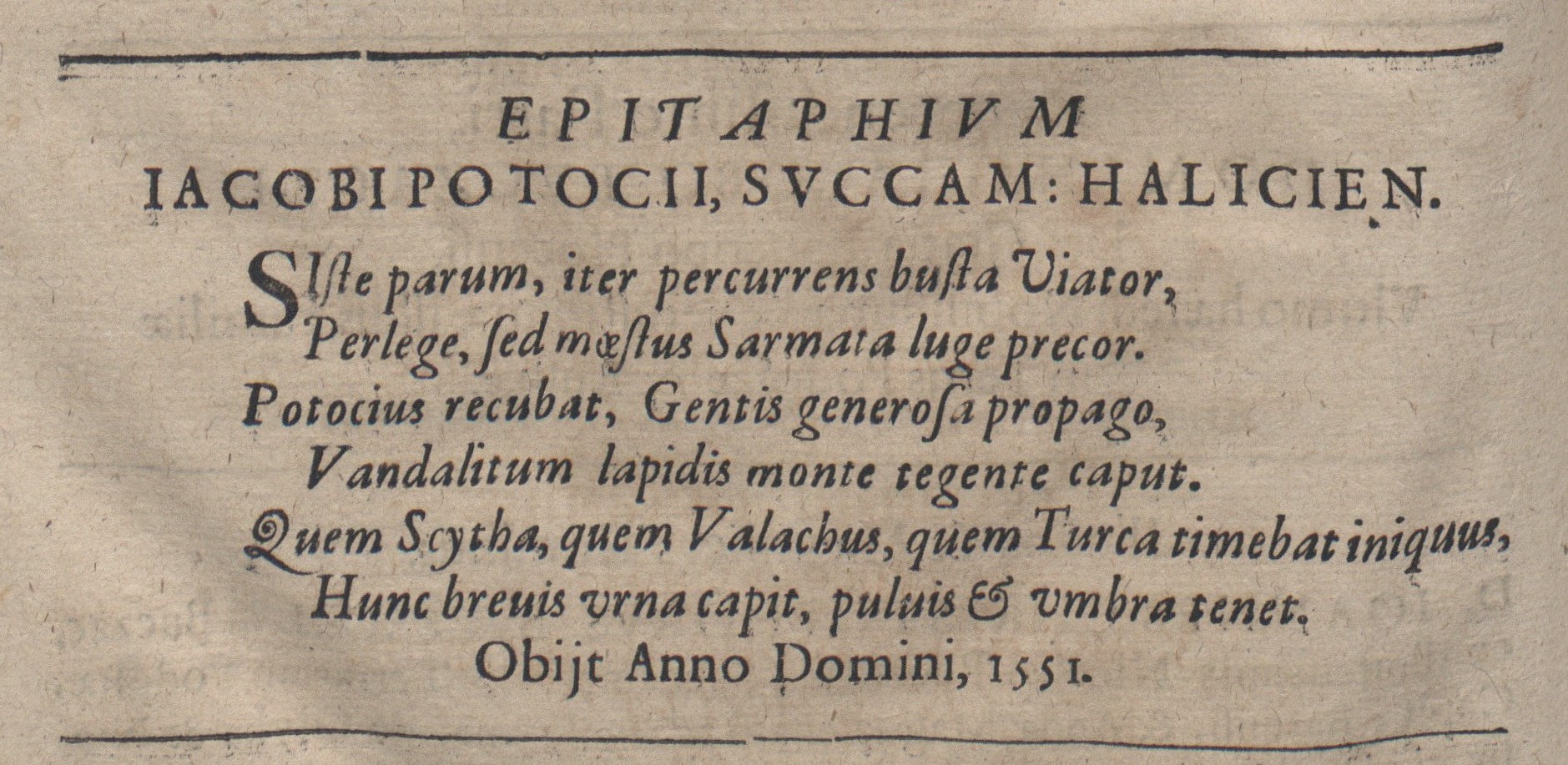 , Tekst epitafium Jakuba Potockiego, zm. 1551, Podkomorzego Halickiego, w nieistniejącej dziś starej farze w Buczaczu., [w:] Polski słownik biograficzny, t. ,