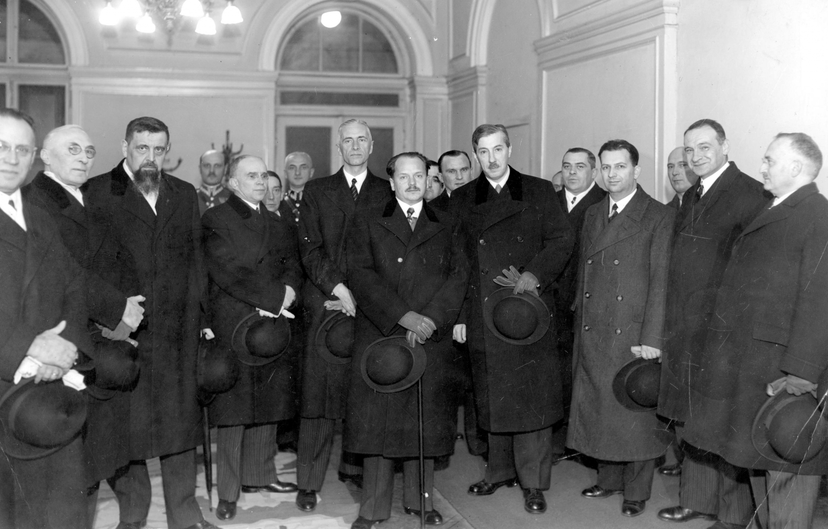 Przedstawiciele rządu na dworcu krakowskim, widoczni m.in. wicewojewoda krakowski Piotr Małaszyński (4. z prawej), minister skarbu Eugeniusz Kwiatkowski (6. z prawej), minister spraw wewnętrznych Marian Zyndram Kościałkowski (stoi obok M. Kościałkowskiego), marszałek senatu Władysław Raczkiewicz (I rząd 5. z lewej), minister komunikacji Michał Butkiewicz (I rząd, 4. z lewej) i wiceminister wyznań religijnych i oświecenia publicznego Konstanty Chyliński (z brodą).