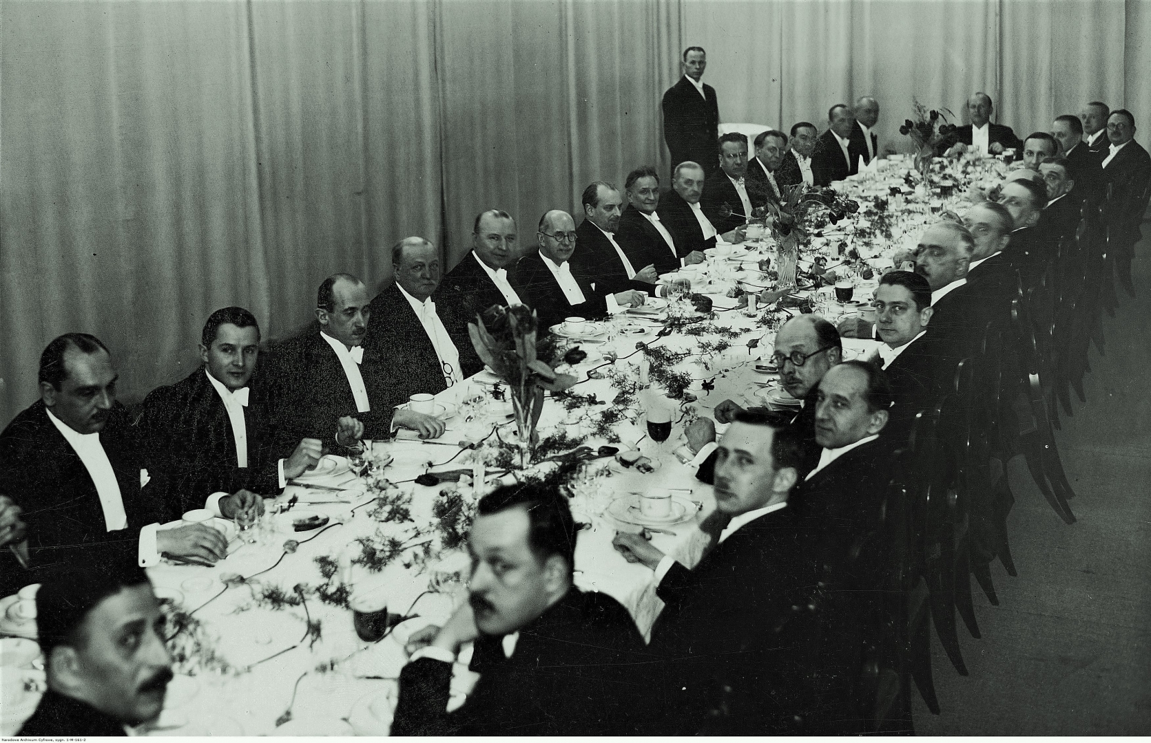 Uczestnicy konferencji na przyjęciu w restauracji mieszczącej się w warszawskim Klubie Towarzyskim przy ul. Pierackiego (Foksal). W pierwszym rzędzie od lewej siedzą m.in.: poseł Jan Hołyński, przedstawciel Francji Pierre Roustan, Tadeusz Schaetzel, Park Coff, poseł Stanisław Car, ambasador Francji w Polsce Jules Laroche, poseł Wacław Makowski, przedstawiciel Francji Mario Roustan, senator Zygmunt Leszczyński, senator włoski Roberto Forages Dovanzatti, senator Henryk Lowenherz, Georges Rabinowitsch, pracownik MSZ Michał Łubieński. W rzędzie drugim od lewej siedzą m.in. radca Aleksander Mohl, poseł Władysław Kosydarski, dyrektor Piasecki, poseł Michał Osiński, senator Józef Targowski, Aurel Cosmax, poseł Janusz Radziwiłł, senator włoski Carlo Costamagna, wiceminister spraw zagranicznych Jan Szembek, senator Zdzisław Lubomirski, poseł francuski Leopold Boissier.