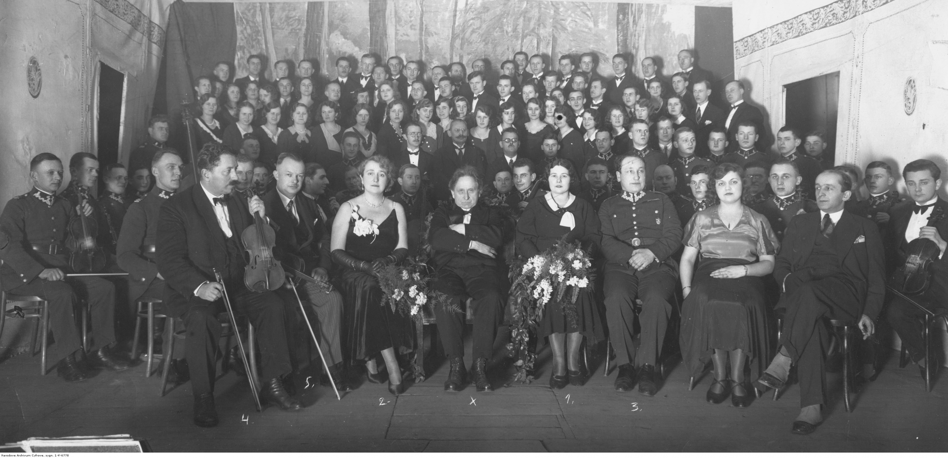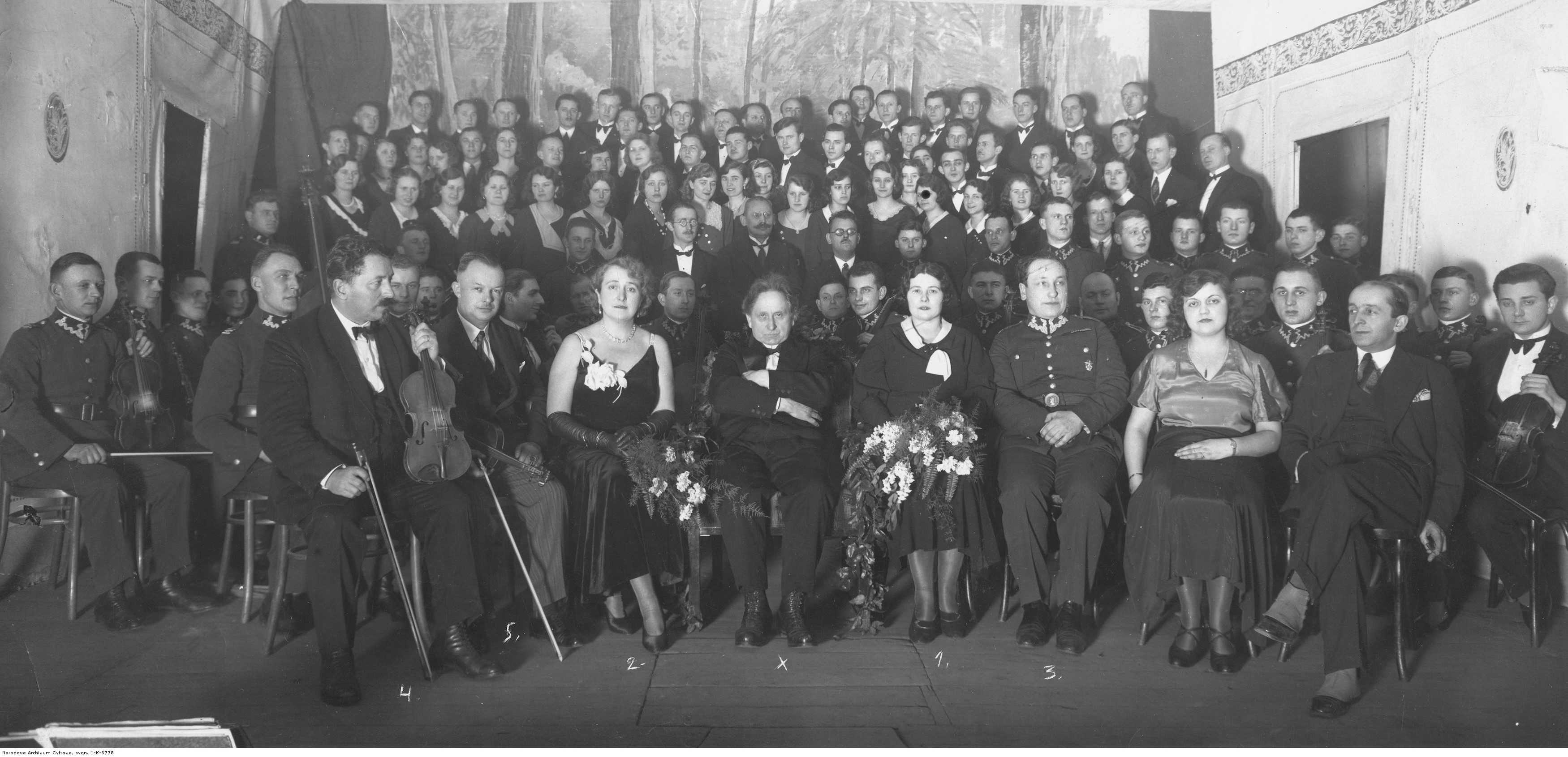W pierwszym rzędzie widoczni m.in.: kompozytor i dyrygent Feliks Nowowiejski (x), jego żona Elżbieta Nowowiejska (1), śpiewaczka Opery Warszawskiej Kałuska (2), dyrygent orkiestry 55 Poznańskiego Pułku Piechoty Aleksander Olszewski (3), skrzypek Julian Szpunar (4), skrzypek Lewandowski (5).