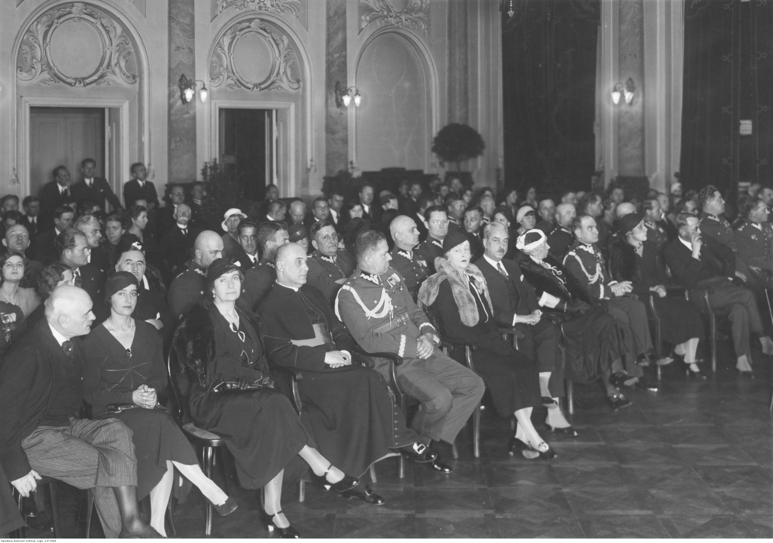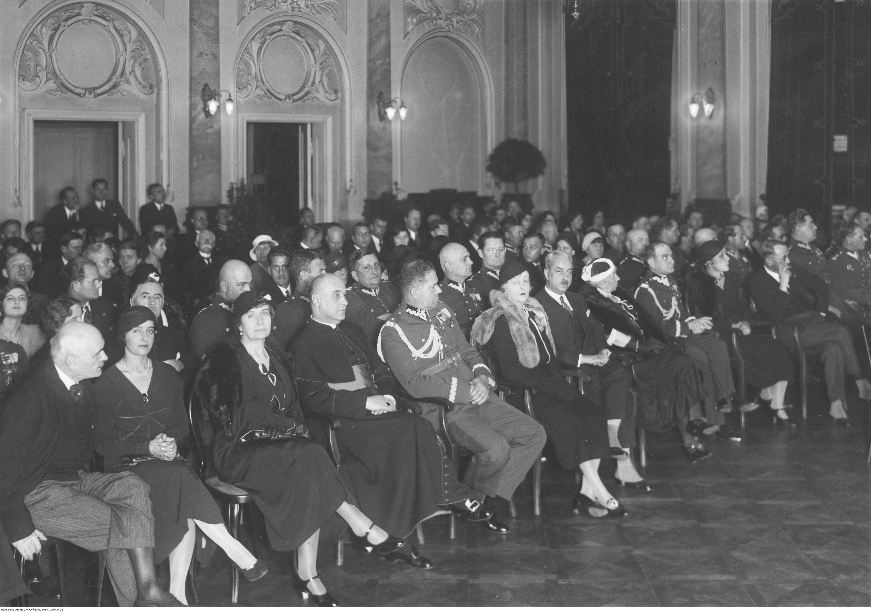 Na sali podczas akademii siedzą w pierwszym rzędzie m.in.: hrabia Breza (1. z lewej), ksiądz Teodor Taczak (4. z lewej), generał Oswald Frank (5. z lewej), Małgorzata de Matuska (6. z lewej), poseł nadzwyczajny i minister pełnomocny Węgier w Polsce Peter de Matuska (7. z lewej), księżna Maria Czartoryska (8. z lewej), generał Sergiusz Zahorski (9. z lewej) i książę Olgierd Czartoryski (11. z lewej).