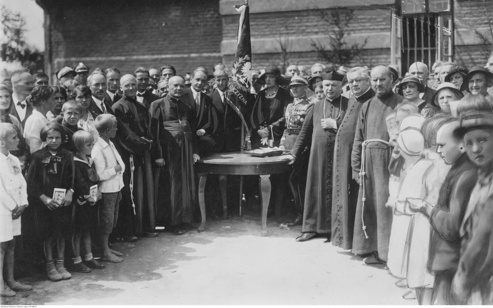Uroczyste wbijanie gwoździ do sztandaru Stowarzyszenia Wychowanków Zakładu Brata Alberta. Wśród uczestników uroczystości widoczni są m.in.: kapelan zakładu ks. Lewkowicz, starosta przemyski Adam Remiszewski, rotmistrzowa Łukasińska, gen. Stanisław Tessaro, ks. infułat Bieda, dyrektor Księży Salezjanów ks. Jan Świerc i przełożony zakładu brat Anioł.