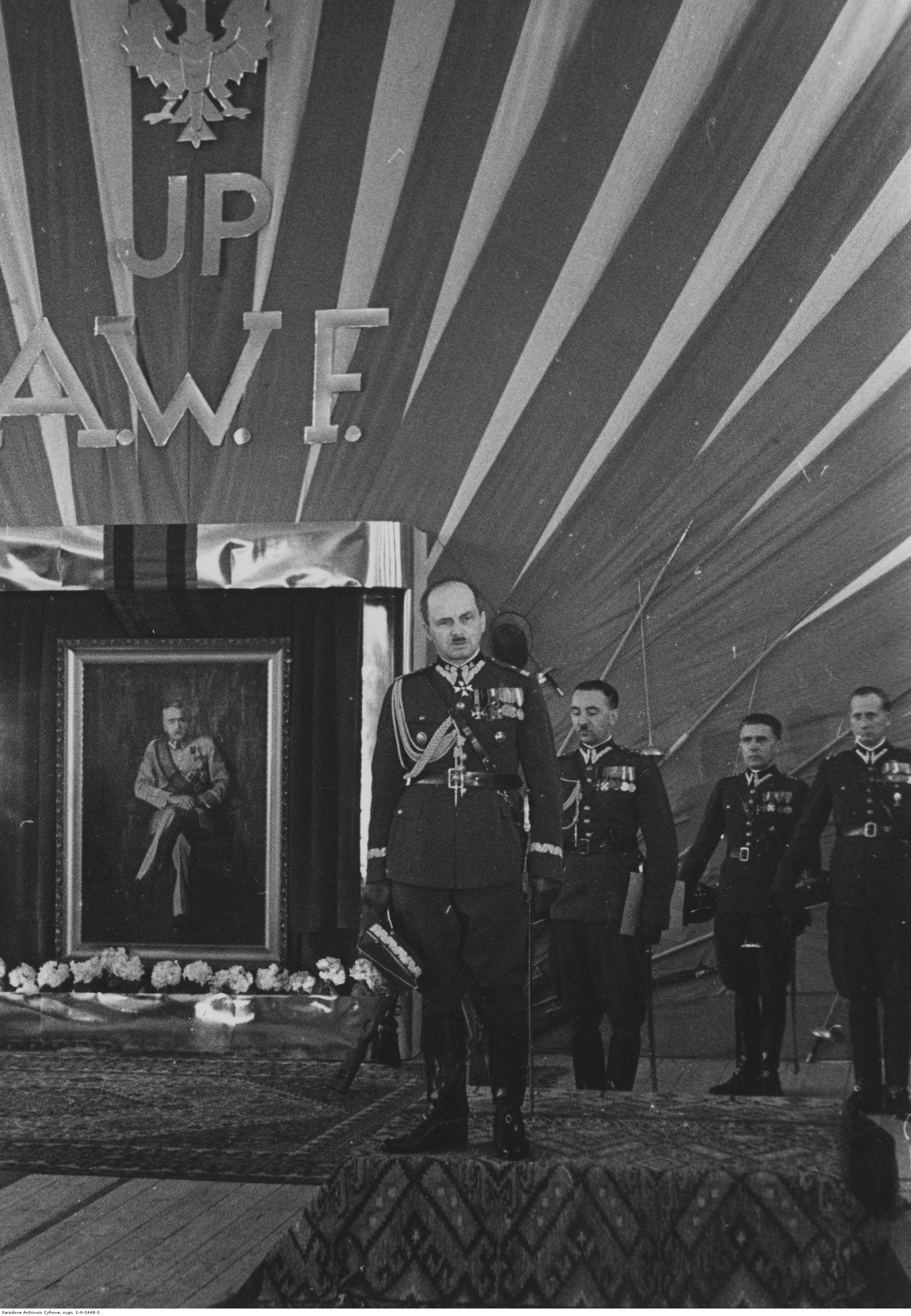 Dyrektor Państwowego Urzędu Wychowania Fizycznego generał Kazimierz Sawicki wygłasza przemówienie podczas uroczystości. W tle widoczny portret Józefa Piłsudskiego.