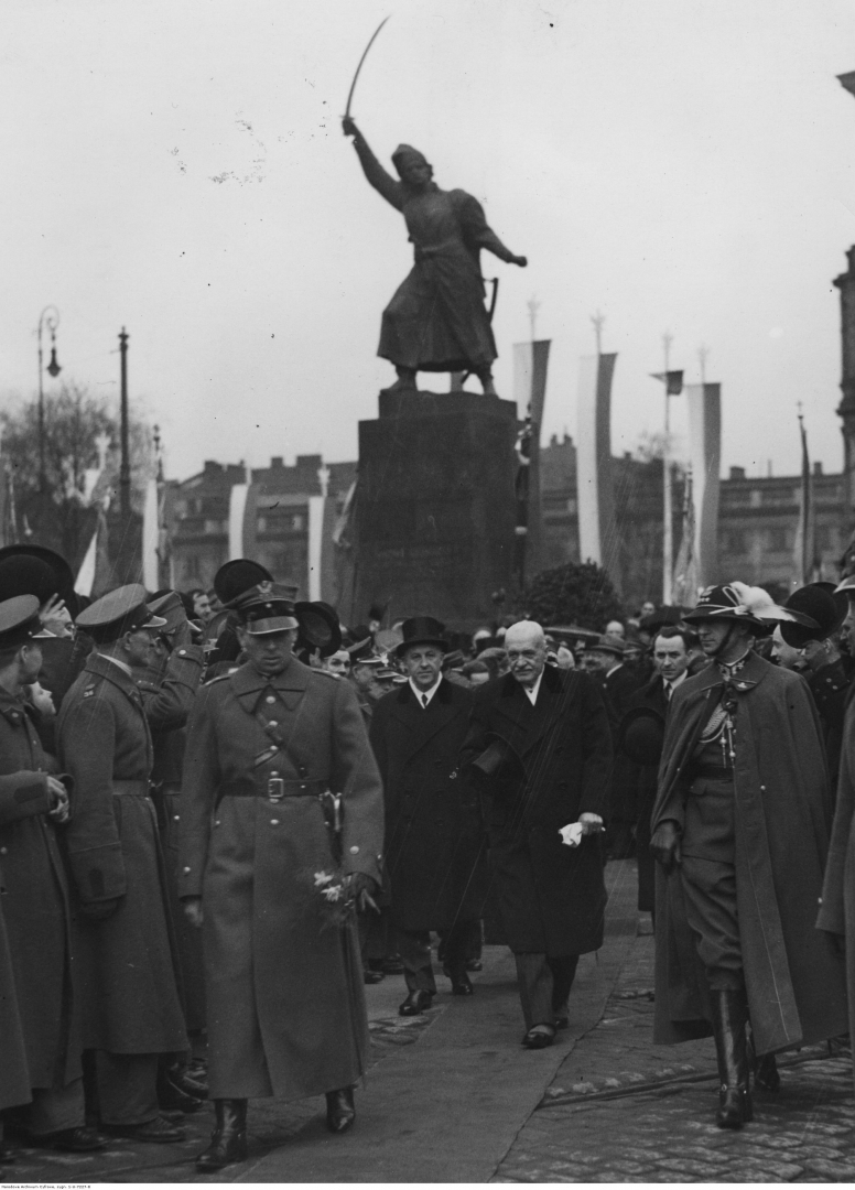 Prezydent RP Ignacy Mościcki (w środku na drugim planie) opuszcza plac Krasińskich po skończonej uroczystości. Widoczni także m.in.: komisarz Rządu na m.st. Warszawę Władysław Jaroszewicz (na lewo od Prezydenta), adiutanci prezydenta RP kapitan Józef Hartman (z prawej) i major Zygmunt Gużewski (z lewej), wiceprezydent Warszawy Józef Ołpiński (na prawo za prezydentem). W głębi widoczny pomnik Jana Kilińskiego.