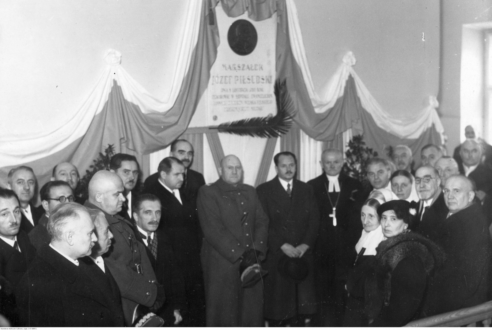 Uczestnicy uroczystości zebrani pod tablicą pamiątkową. Widoczni m.in.: pastor Juliusz Bursche, minister pracy i opieki społecznej Marian Zyndram Kościałkowski (stoi na prawo od A. Litwinowicza), generał Aleksander Litwinowicz (stoi w środku), prezydent Warszawy Stefan Starzyński (stoi na lewo mod A. Litwinowicza), generał Stanisław Rouppert (stoi z lewej), wicekomisarz Rządu na miasto stołeczne Warszawę Kazimierz Jurgielewicz (stoi na prawo za gen.Rouppertem), minister komunikacji Juliusz Ulrych (stoi na prawo od J. Bursche).