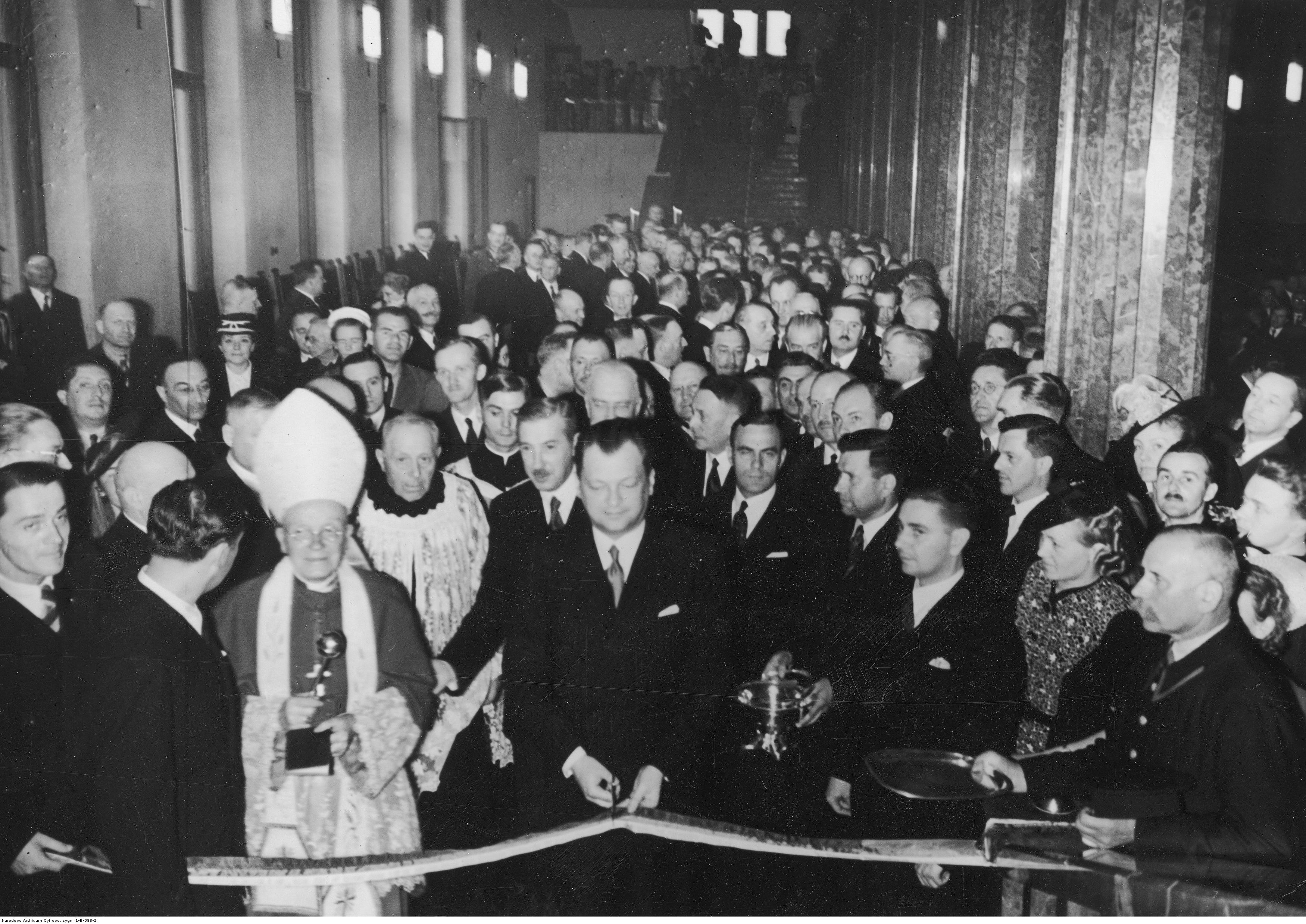 Minister sprawiedliwości Witold Grabowski przecina wstęgę podczas uroczystości. Widoczni m.in.: wicepremier Eugeniusz Kwiatkowski (stoi na lewo za W. Grabowskim), prezes Sądu Najwyższego Leon Supiński, wicekomisarz Rządu na miasto stołeczne Warszawę Kazimierz Jurgielewicz.