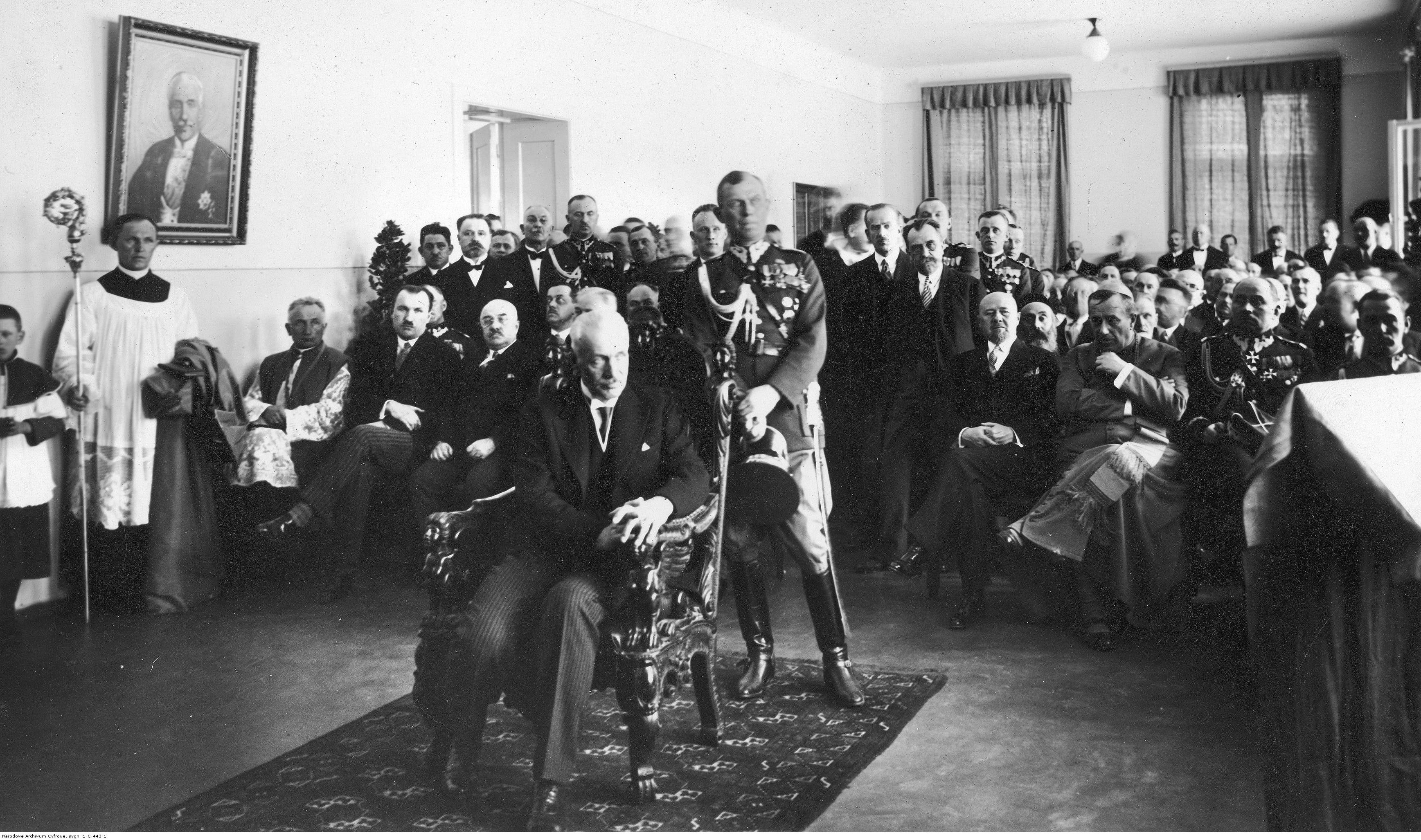 Wśród uczestników uroczystości widoczni m.in.: prezydent RP Ignacy Mościcki (siedzi na fotelu sam), adiutant prezydenta RP Ignacego Mościckiego rotmistrz Wacław Calewski (stoi za prezydentem), minister pracy i opieki społecznej Aleksander Prystor (I rząd 4. z prawej), biskup łódzki Wincenty Tymieniecki (I rząd 3. z prawej), szef Kancelarii Cywilnej Prezydenta RP Adam Lisiewicz (I rząd 2. z prawej).