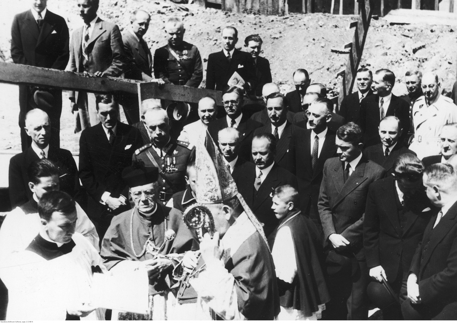 Biskup Stanisław Gall dokonuje poświęcenia kamienia węgielnego. Widoczni m.in.: generał Kazimierz Sosnkowski, prezes Światowego Związku Polaków z Zagranicy Władysław Raczkiewicz, minister Marian Zyndram Kościałkowski, sekretarz generalny Światowego Związku Polaków z Zagranicy Stefan Lenartowicz.
