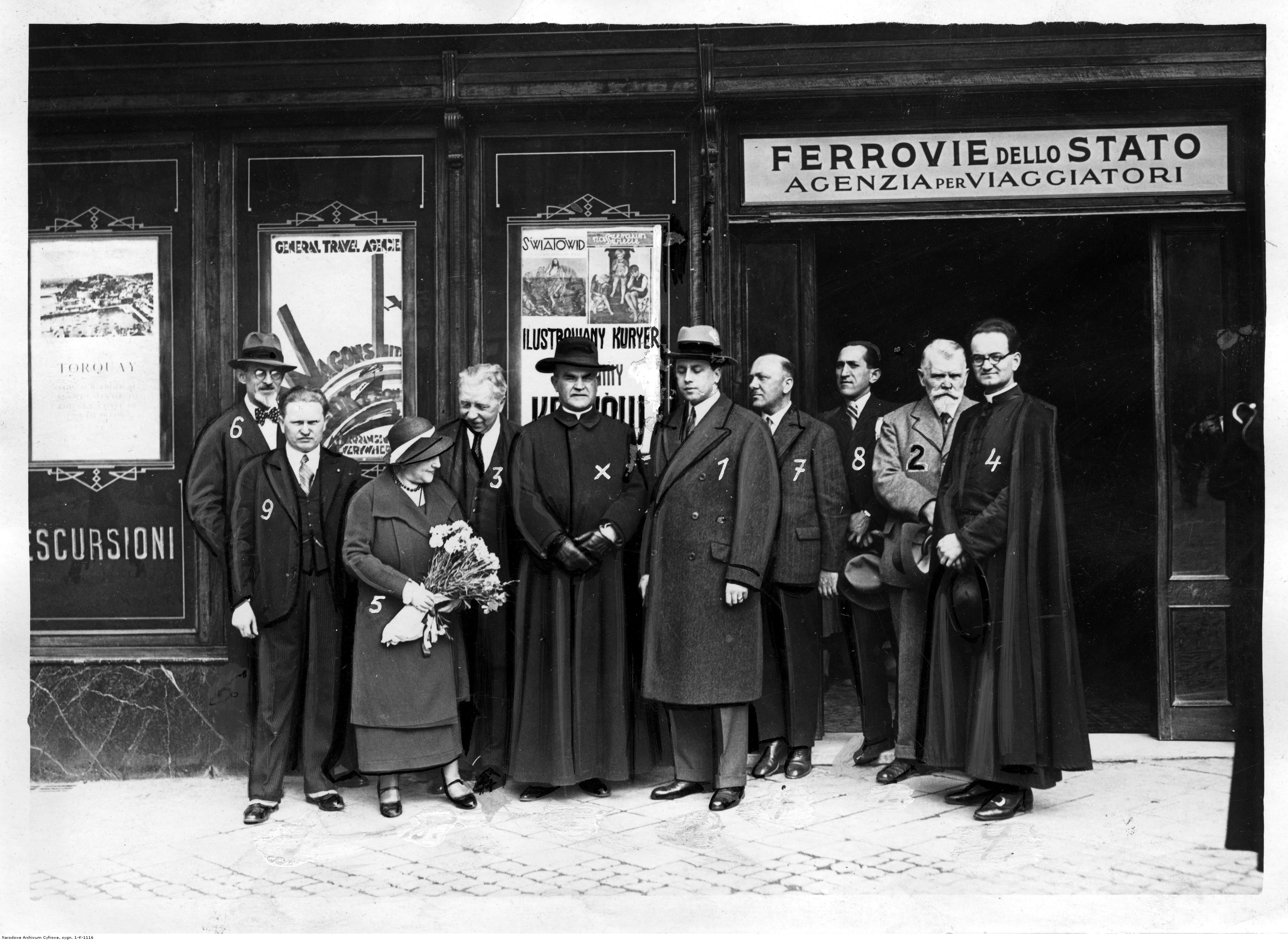 Przed oddziałem IKC w Rzymie widoczni: bp Ignacy Dub-Dubowski (trzeci z lewej), prof. Antoni Madeyski (drugi z prawej), radca ambasady Tadeusz Romer (piąty z prawej), prof. Mazurowski (siódmy z prawej), ks. dr Ludwik Kociszewski (pierwszy z prawej), Ofelia Colautti-Novak (druga z lewej), red. Leonard Kociemski (pierwszy z lewej, z tyłu), prof. Korzeniowski (czwarty z prawej), red. Kleinberger (trzeci z prawej), red. Gustaw Lawina (pierwszy z lewej).