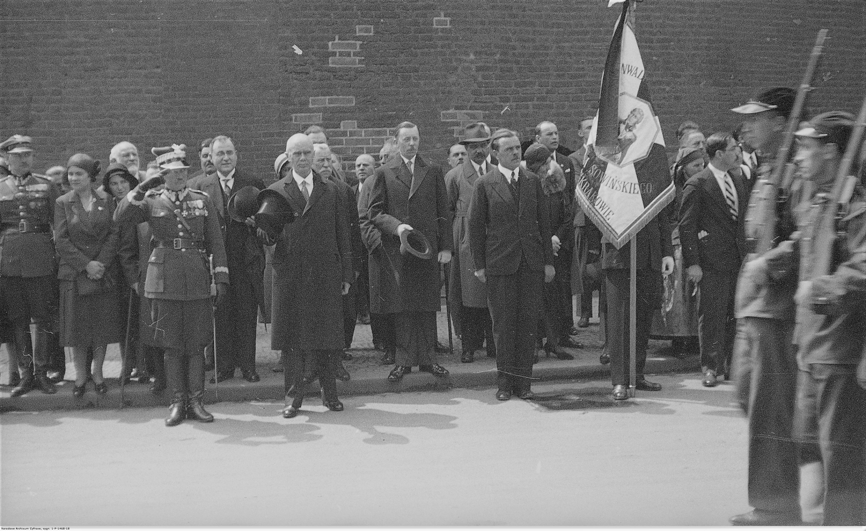 Uczestnicy uroczystości oczekujący na przemarsz defilujących oddziałów. W pierwszym rzędzie widoczni m.in.: wojewoda krakowski Mikołaj Kwaśniewski i generał Mieczysław Smorawiński oraz poczet sztandarowy z poświęconym sztandarem.