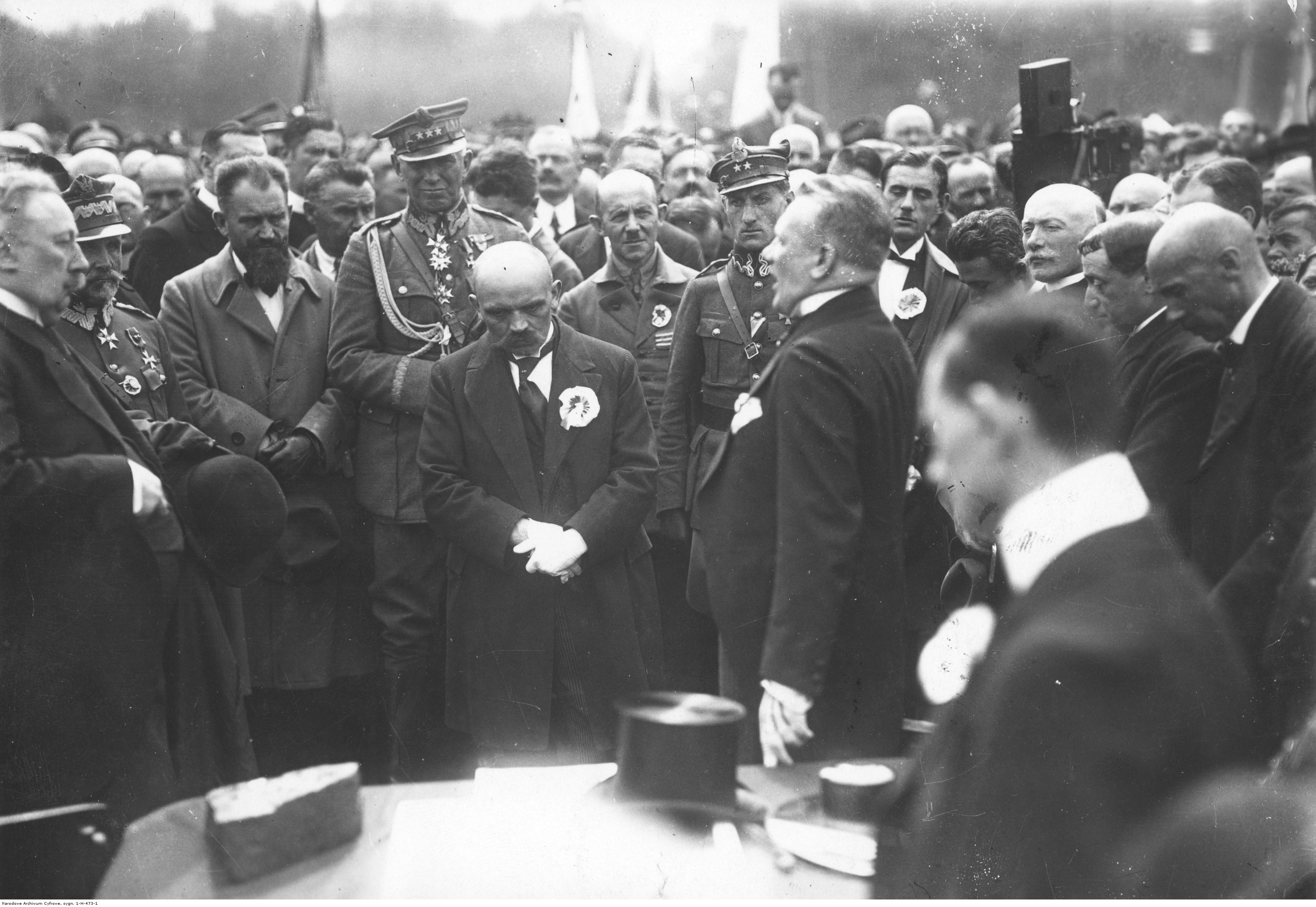 Uroczystość przejęcia Śląska przez Polskę 16.07.1922 r. share Podziel się facebook google + twitter linkedin clipboard envelope print quote picture add × Cytowane źródła Cytowanie źródła on-line, czyli Internetowego Polskiego Słownika Biograficznego Uroczystość przejęcia Śląska przez Polskę 16.07.1922 r., [online] Warszawa: Narodowy Instytut Audiowizualny [dostęp 27.02.2026]. Dostępny w internecie: http://www.biogramy.pl/a/foto/uroczystosc-przejecia-slaska-przez-polske-16071922-r-1 Cytowanie wydania drukowanego, czyli Polskiego Słownika Biograficznego , Uroczystość przejęcia Śląska przez Polskę 16.07.1922 r., [w:] Polski słownik biograficzny, t. , IPSBID: ipsb-fo-97411 × Wyślij link do strony E-mail odbiorcy wiadomości: To pole jest wymaganeWpisz poprawny adres e-mail Twój adres e-mail: To pole jest wymaganeWpisz poprawny adres e-mail Podgląd wiadomości, która zostanie wysłana: Witaj, [Tutaj podany Twój e-mail] poleca Ci treść z iPSB (internetowym Polskim Słowniku Biograficznym) Uroczystość przejęcia Śląska przez Polskę 16.07.1922 r. × Dodaj do kolekcji wybierz kolekcję, do której chcesz dodać ten artykuł: lub wpisz nazwę nowej kolekcji, do której chcesz dodać ten artykuł: : To pole jest wymagane Dodaj do kolekcji Wybierz kolekcję Swoje kolekcje znajdziesz w profilu. Wystarczy kliknąć ikonę zębatego koła w górnym prawym rogu. Możesz je zobaczyć tu: moje kolekcje. × Dodaj do kolekcji Element został dodany do Twojej kolekcji. Swoje kolekcje możesz zobaczyć tu: moje kolekcje. × Dodaj do kolekcji Aby dodawać materiały do kolekcji musisz się zalogować. OPIS POSTACI POWIąZANE Przemówienie ministra spraw wewnętrznych Antoniego Kamieńskiego. Widoczni również: wojewoda śląski Józef Rymer (stoi w środku, łysy), generał Stanisław Szeptycki (stoi za wojewodą śląskim) oraz marszałek sejmu Wojciech Trąmpczyński. Postaci powiązane Józef Rymer 1882-02-09 - 1922-12-05 wojewoda śląski Wojciech Trąmpczyński (Otto-Trąmpczyński) 1860-02-08 - 1953-10-19 polityk Stanisław Maria Szeptycki 1867-11-03 - 1950-10-09 generał broni WP Antoni Kamieński 1878-06-13 - 1944 polityk więcej >> Zobacz zdjęcie w najwyższej jakości Źródło