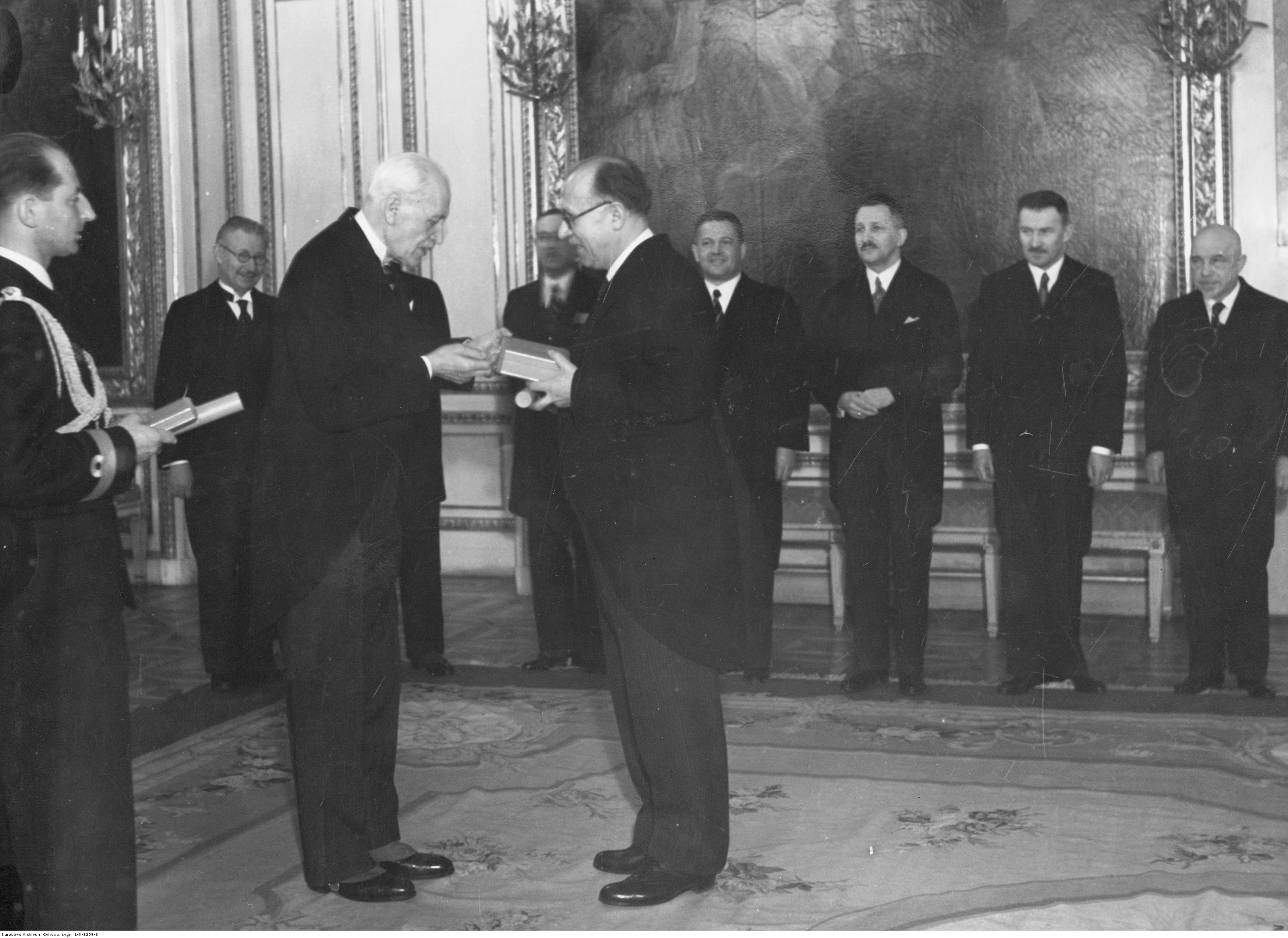 Prezydent RP Ignacy Mościcki (2. z lewej) wręcza odznaczenie prof. Kazimierzowi Bartlowi. Widoczni także m.in.: minister wyznań religijnych i oświecenia publicznego Wojciech Świętosławski (w głębi 1. z lewej, w okularach), adiutant prezydenta RP kapitan Marynarki Wojennej Stefan Kryński (1. z lewej na pierwszym planie).