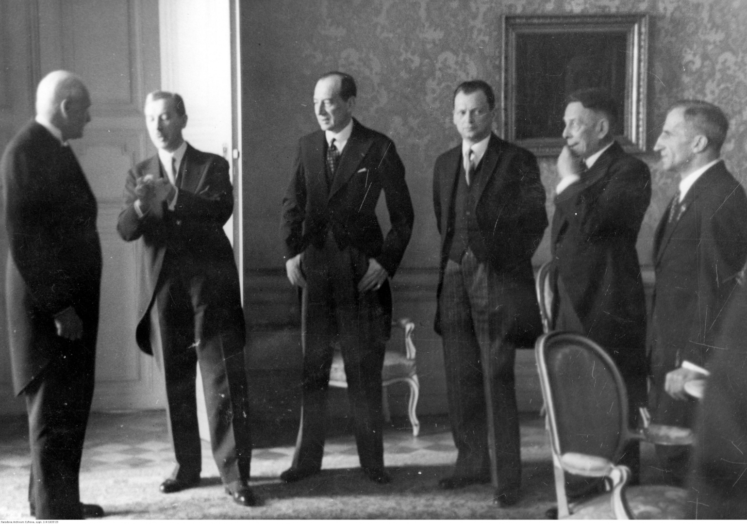 Prezydent RP Ignacy Mościcki w rozmowie z członkami rządu przybyłymi na Zamek Królewski. Od lewej: prezydent RP Ignacy Mościcki, wicepremier Eugeniusz Kwiatkowski, minister spraw zagranicznych Józef Beck, minister sprawiedliwości Witold Grabowski, prezes Sądu Najwyższego Leon Supiński, minister rolnictwa i reform rolnych Juliusz Poniatowski.