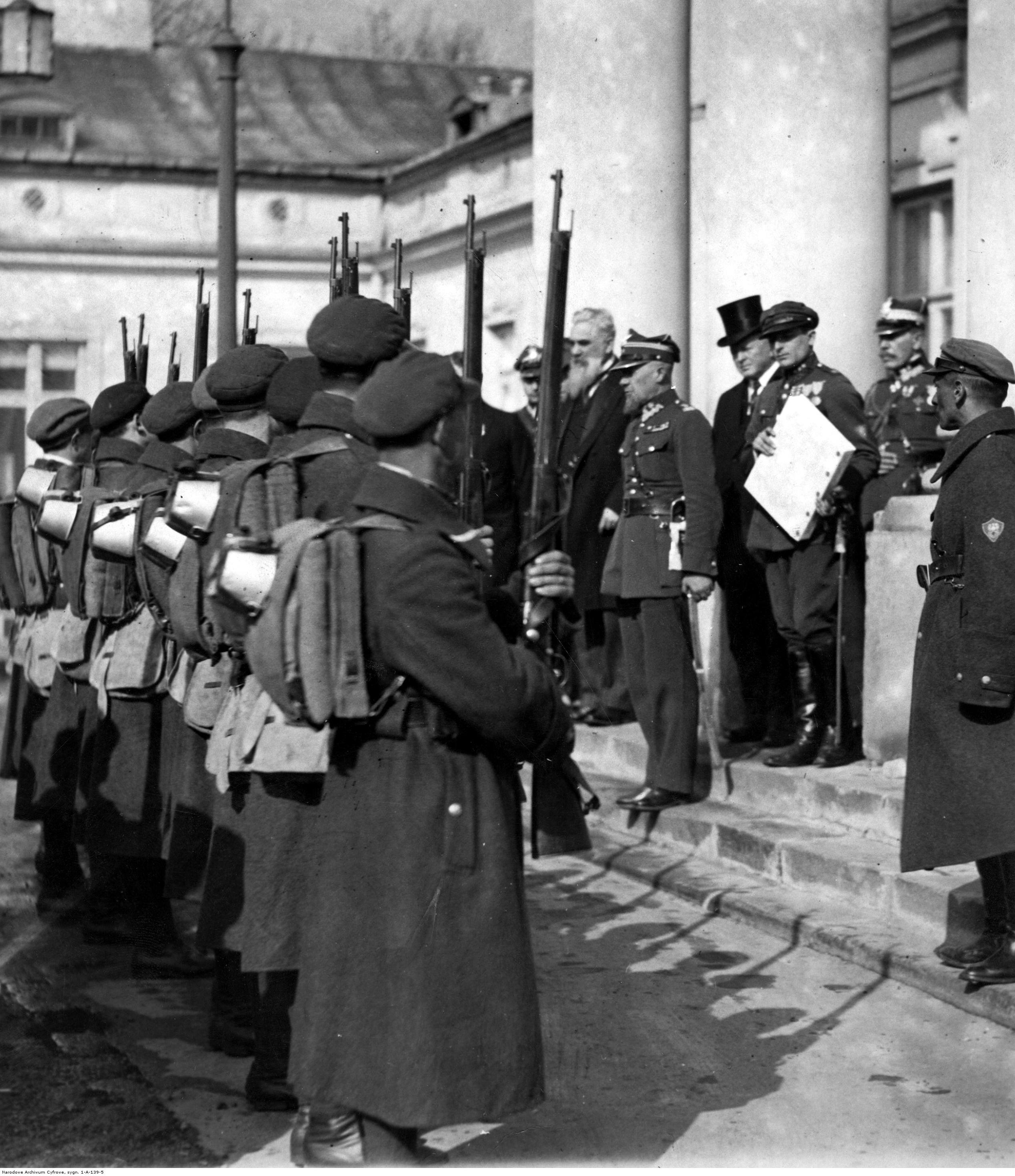 Sztafeta wileńska w Belwederze przybyła w celu wręczenia pisma z życzeniami imieninowymi dla Józefa Piłsudskiego. Widoczni m.in.: ppłk Aleksander Prystor (stoi na drugim stopniu, piąty od prawej), marszałek senatu Julian Szymański (czwarty z prawej), dr Kazimierz Dłuski (szósty z prawej).