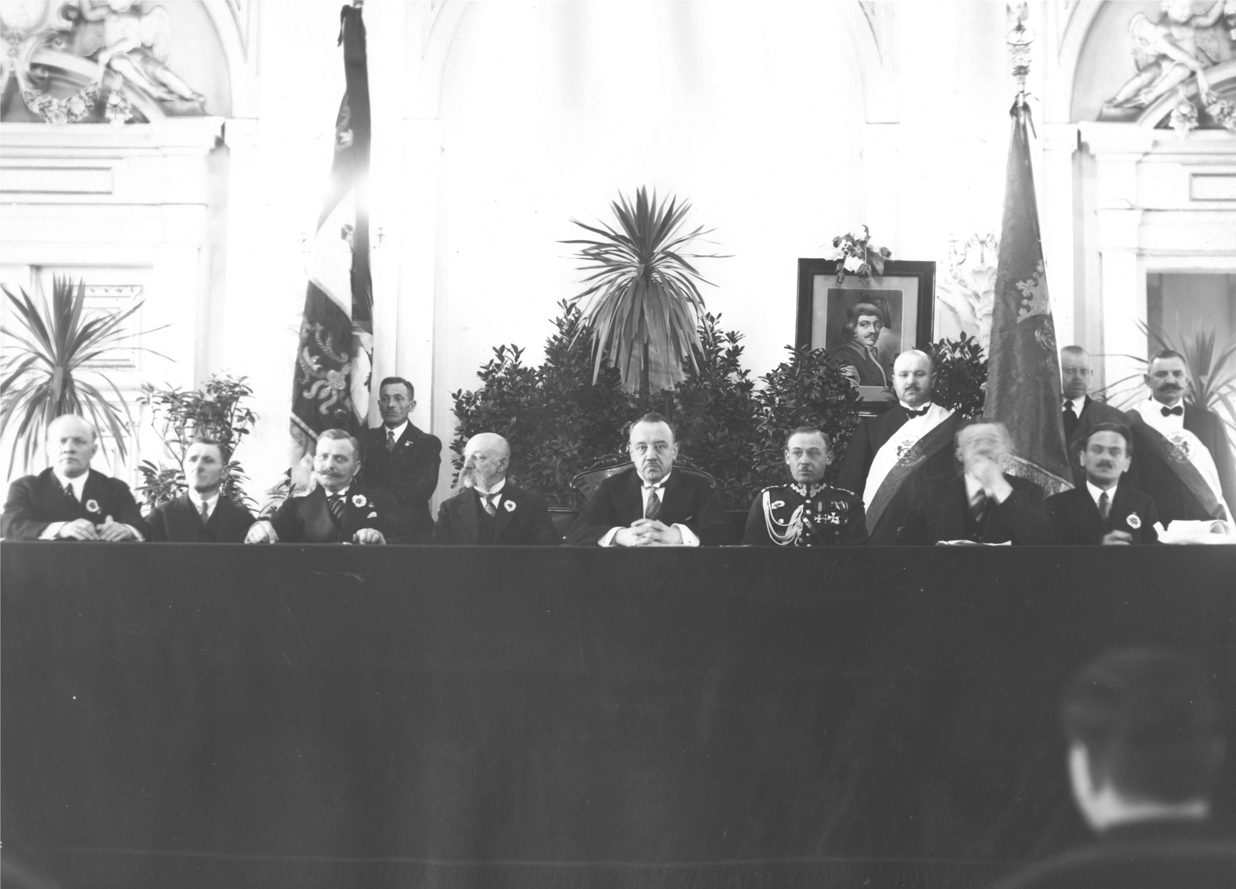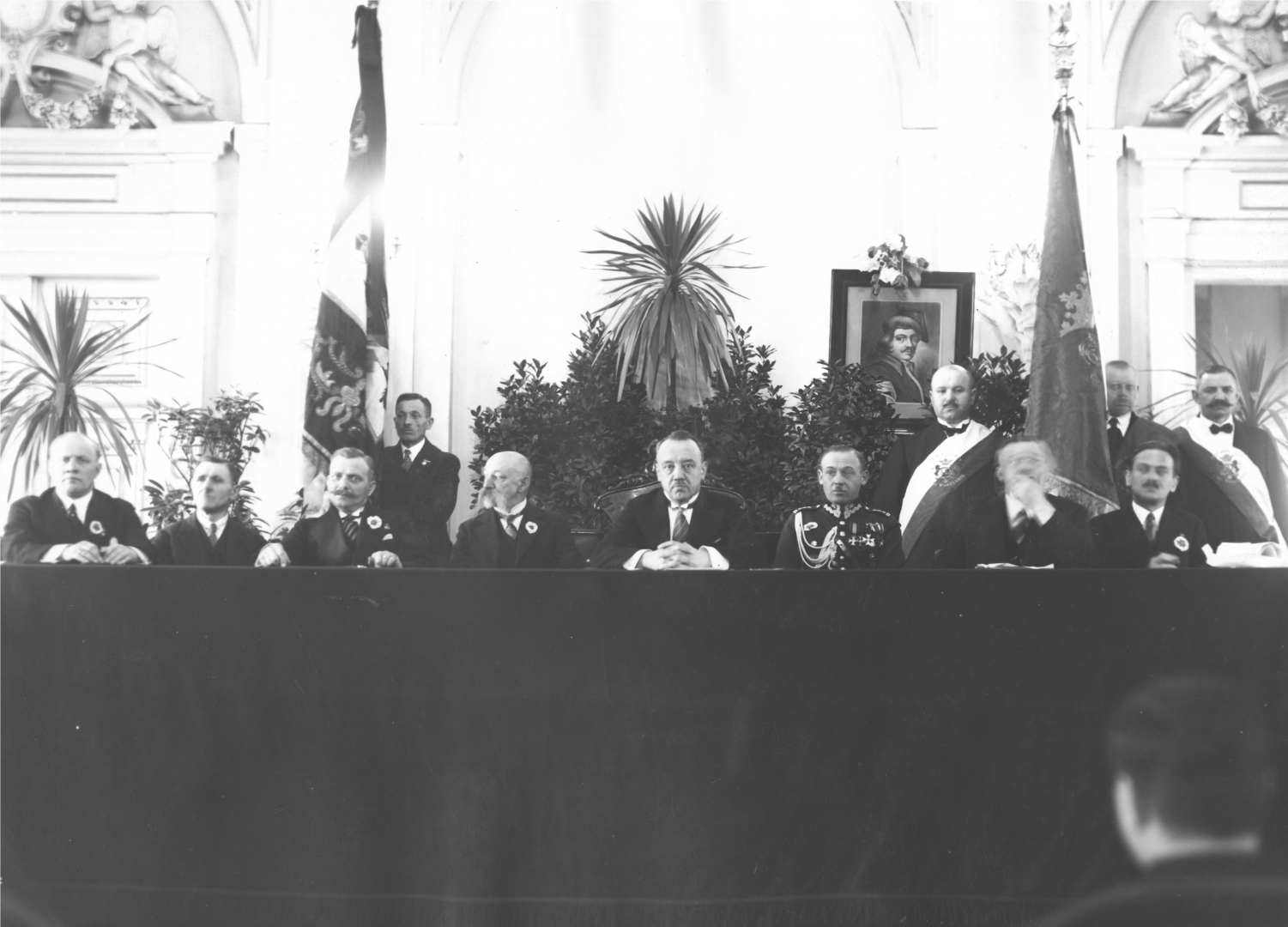 Prezydium akademii w sali Rady Miejskiej. Siedzą m.in. prezydent Warszawy Zygmunt Słomiński (5. z lewej), dyrektor Państwowego Urzędu Wychowania Fizycznego i Przysposobienia Wojskowego płk Władysław Kiliński (6. z lewej), Antoni Kiliński (4. z lewej), poseł Antoni Snopczyński (1. z prawej).