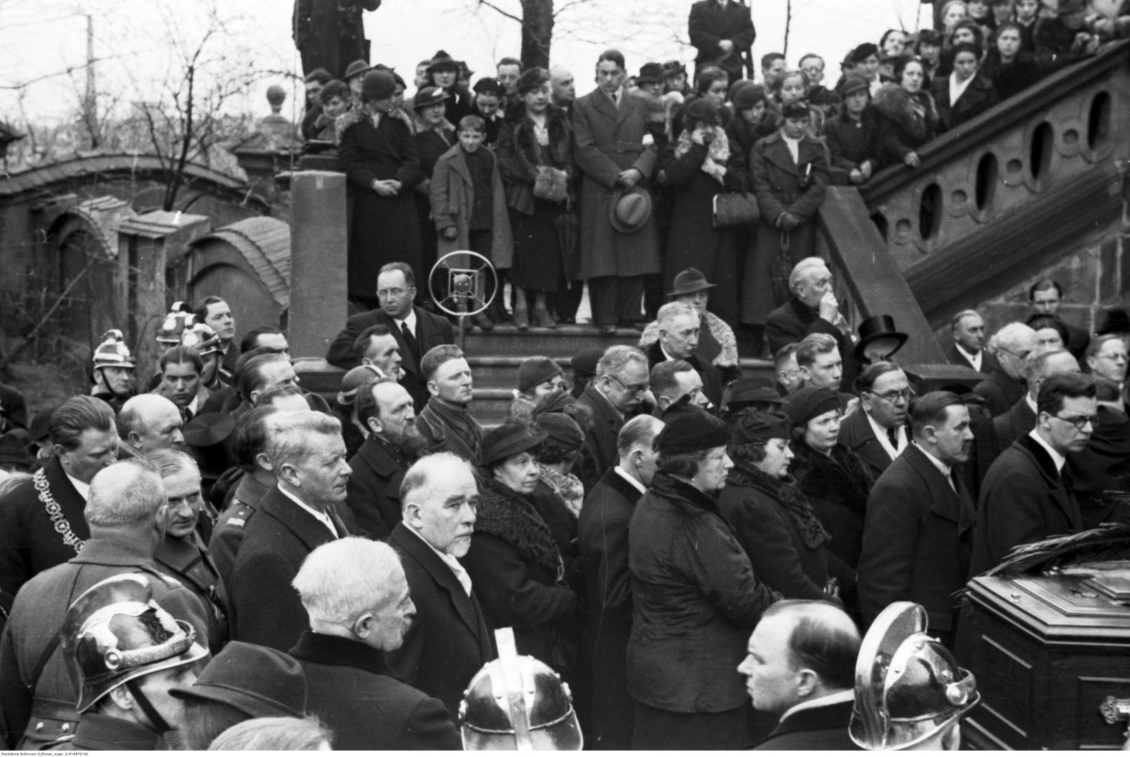 Trumna ze zwłokami Karola Szymanowskiego przed wejściem do Krypty Zasłużonych kościoła kościoła oo. Paulinów na Skałce. Widoczni m.in.: wiceminister wyznań religijnych i oświecenia publicznego Józef Ujejski (z jasną brodą), gen. Aleksander Narbut-Łuczyński (z czarną wstążką na klapie), wojewoda krakowski Michał Gnoiński (na lewo od Ujejskiego), prof. Zdzisław Jachimecki (wyciera nos).