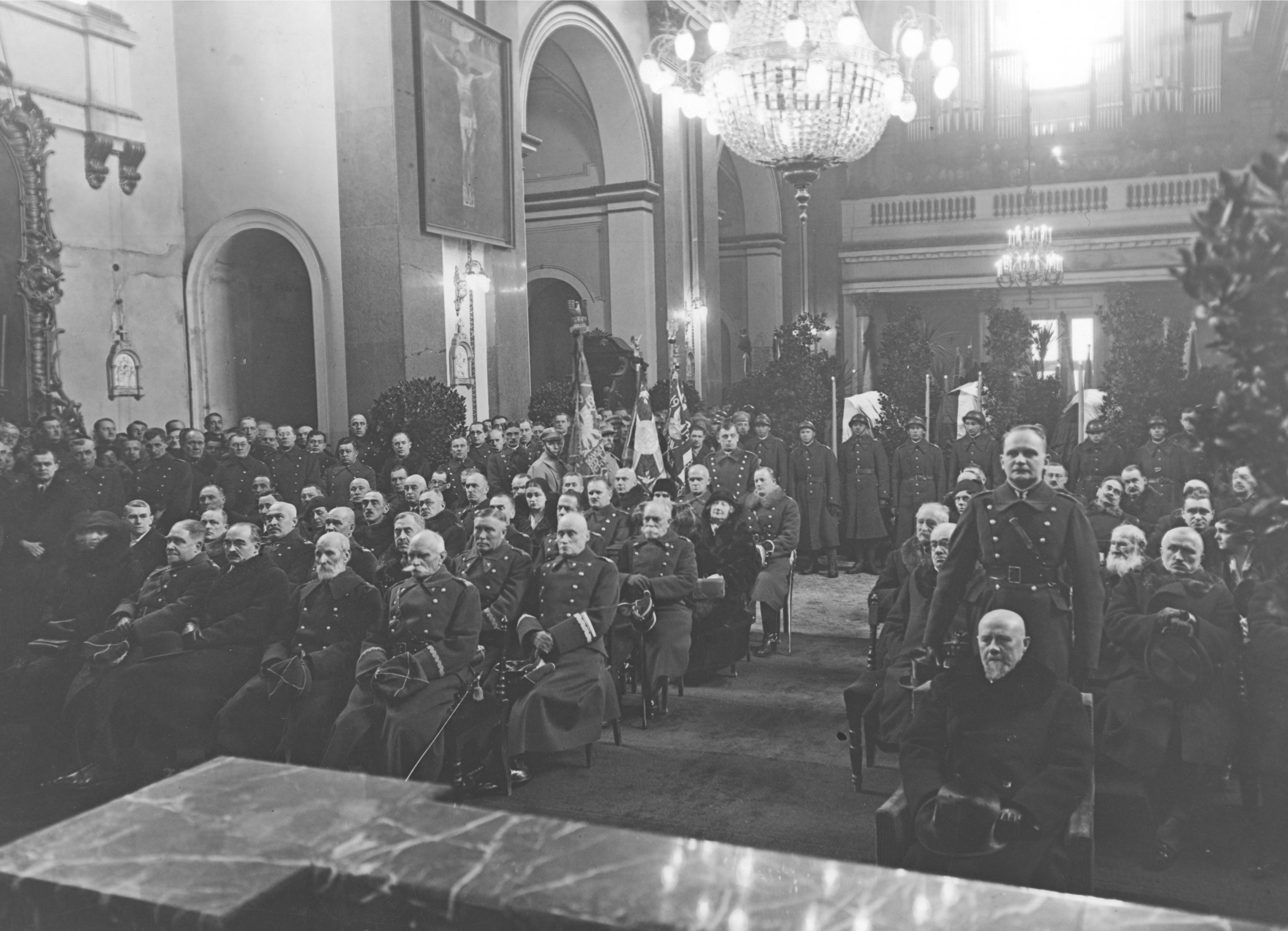 Symboliczny pogrzeb oficerów byłej 2 Brygady Legionów Polskich: podpułkownika Bogusława Szula, majora Władysława Gniadego i kapitana Rudolfa Brandysa poległych w okresie walk o niepodległość w kościele garnizonowym pw. Najświętszej Maryi Panny Królowej Korony Polskiej. Widoczni m.in.: premier Aleksander Prystor (I rząd 1. z prawej), minister przemysłu i handlu Ferdynand Zarzycki (II rząd 1. z prawej), wiceminister pracy i opieki społecznej Eugeniusz Piestrzyński (I rząd 4. z prawej), kontradmirał Jerzy Świrski, generał Jakub Krzemieński, generał Aleksander Osiński, generał Andrzej Galica, generał Roman Górecki, generał Walerian Czuma, weteran Franciszek Stankiewicz. W głębi widoczni także m.in.: szef Gabinetu Wojskowego Prezydenta RP płk Jan Głogowski i mjr Władysław Dunin-Wąsowicz.