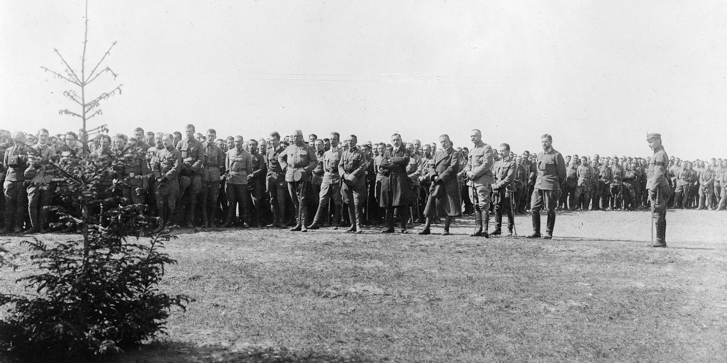 Msza święta polowa odprawiana przez księdzia biskupa Władysława Bandurskiego w intencji pułku. Widoczni m.in.: major Michał Żymierski (2. z prawej), Józef Piłsudski (3. z prawej), książę Andrzej Lubomirski (4. z prawej), generał Stanisław Puchalski (1. z lewej w 1. rzędzie), pułkownik Władysław Sikorski (1. z lewej w 2. rzędzie, stoi za gen. Puchalskim), major Mieczysław Ryś-Trojanowski (za Piłsudskim).
