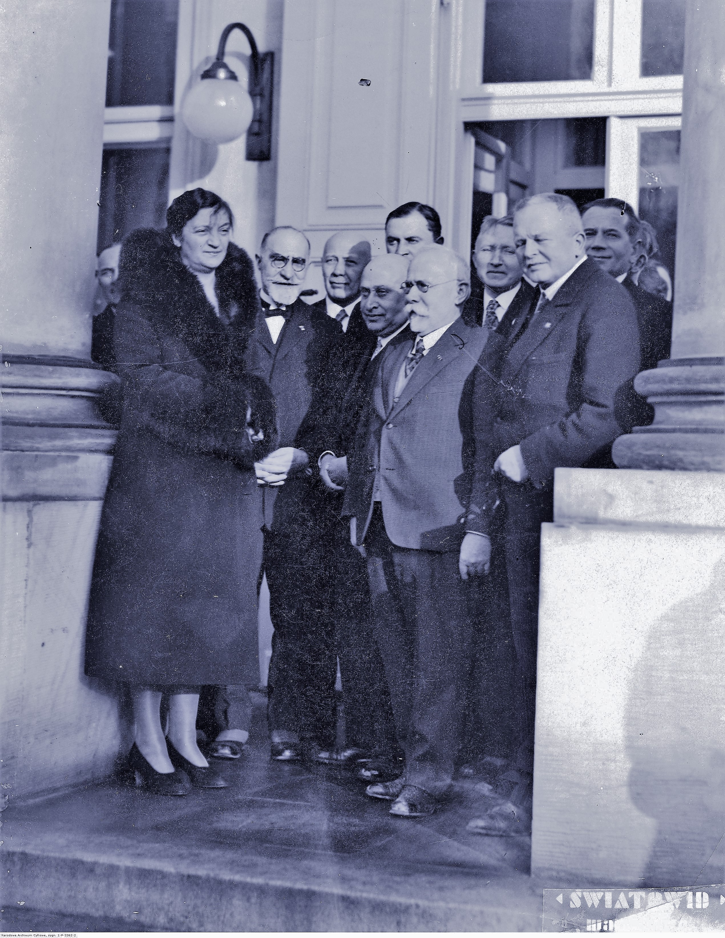 Członkowie komitetu organizacyjnego obchodów z Aleksandrą Piłsudską. W pierwszym rzędzie od lewej widoczni: 1. prof. Julian Szymański, 2. pisarz Wacław Sieroszewski, 3. adw. Michał Wyrostek, 4. senator Ludwik Evert. W drugim rzędzie od lewej widoczni: 1. były senator Jan Rogowicz, 2. wiceprezydent Warszawy Ryszard Błędowski.